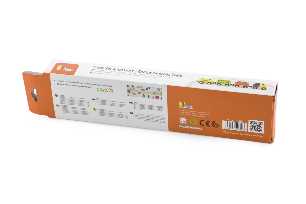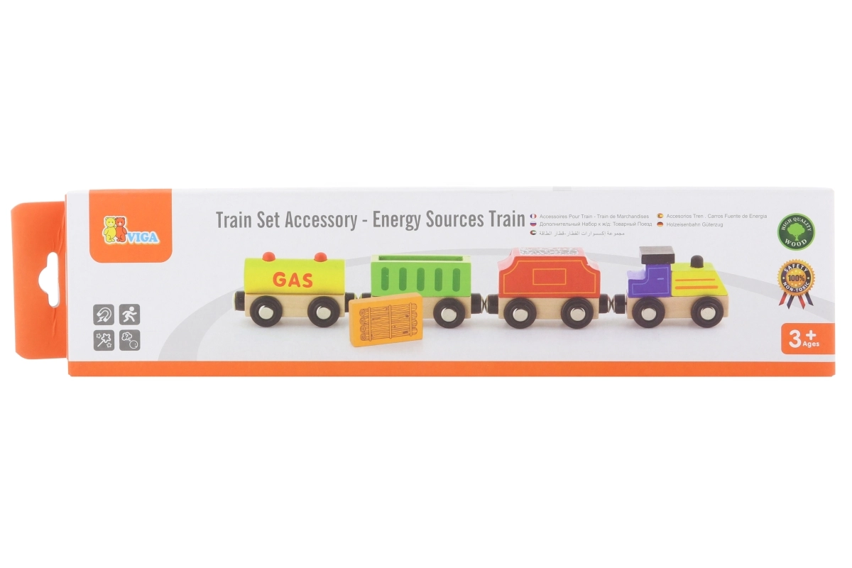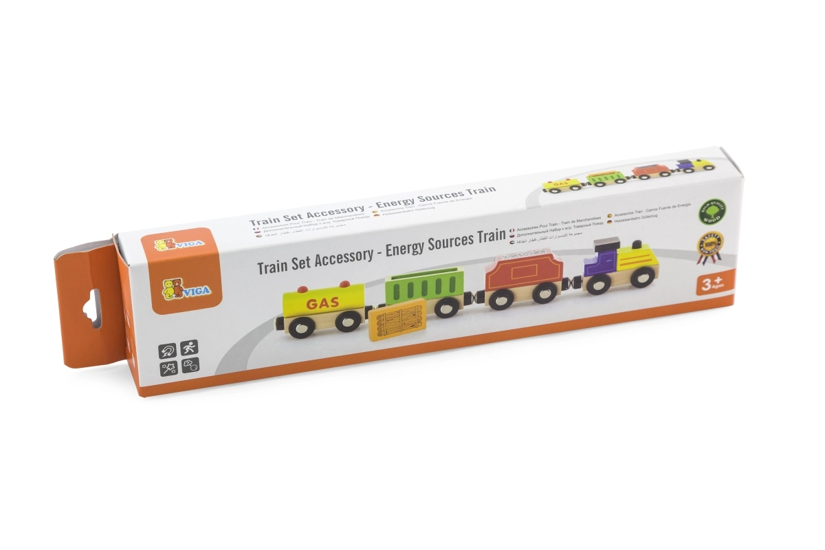 Влакчето VIGA на тема енергийни източници носи много забавление и учене. Комплектът съдържа локомотив и три различни вагона (напр. цистерна, товарен и въглищен вагон), които децата лесно свързват с магнити. Качествената дървена изработка и пъстър дизайн приканват към игра и развиват въображението.
