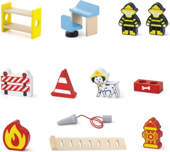 В комплекта ще намерите всичко за незабавна игра: сграда на станцията, 2-ма пожарникари, хеликоптер, пожарна кола, хидрант, двуетажно легло, стол, контролен панел и стълба. Материалите и боите са безопасни и нетоксични, за да играят децата без притеснения. Идеален като подарък, който радва и е издръжлив.