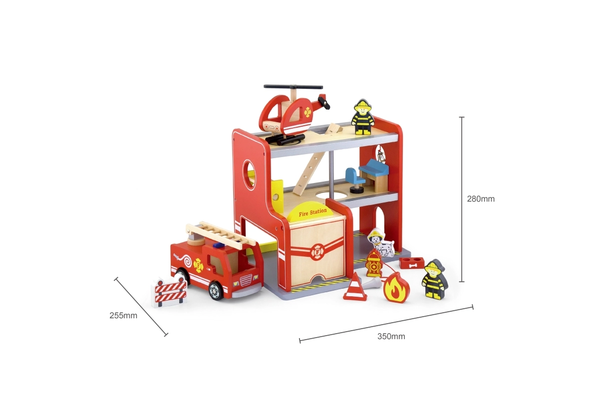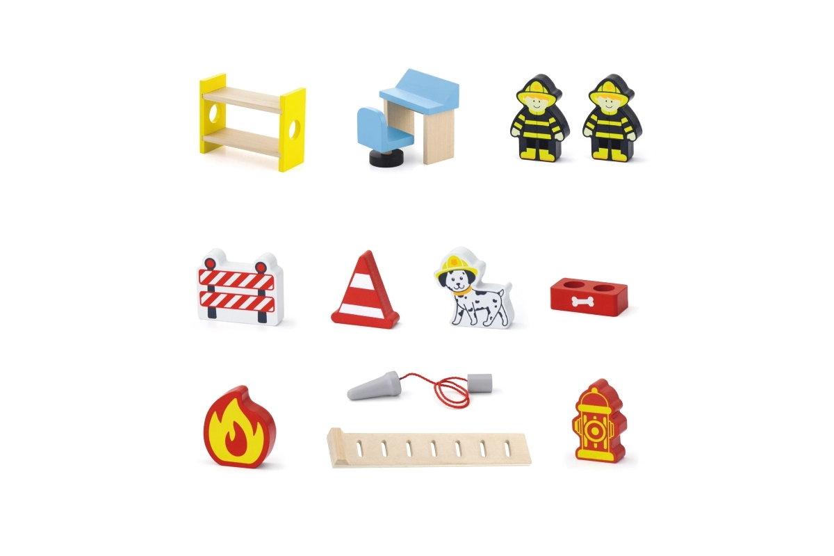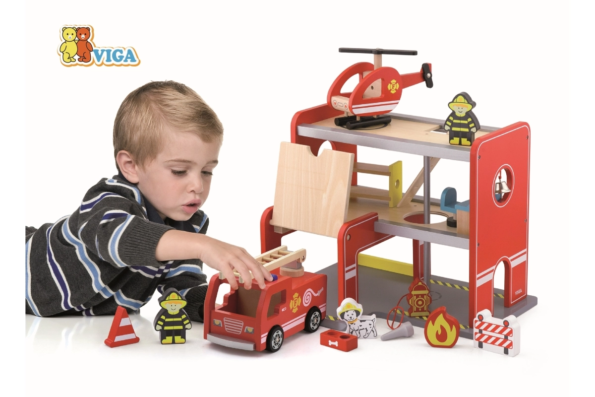 Дървената пожарна станция Viga е комплект за игра с няколко нива, който подпомага ролева игра, развитието на фината моторика и въображението. Децата могат да излизат от гаража с колата, да кацат с хеликоптера на горната площадка и да се спускат по тръбата директно към инцидента. Цветните детайли и качествената дървена конструкция осигуряват атрактивен вид и издръжливост при ежедневна употреба.