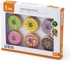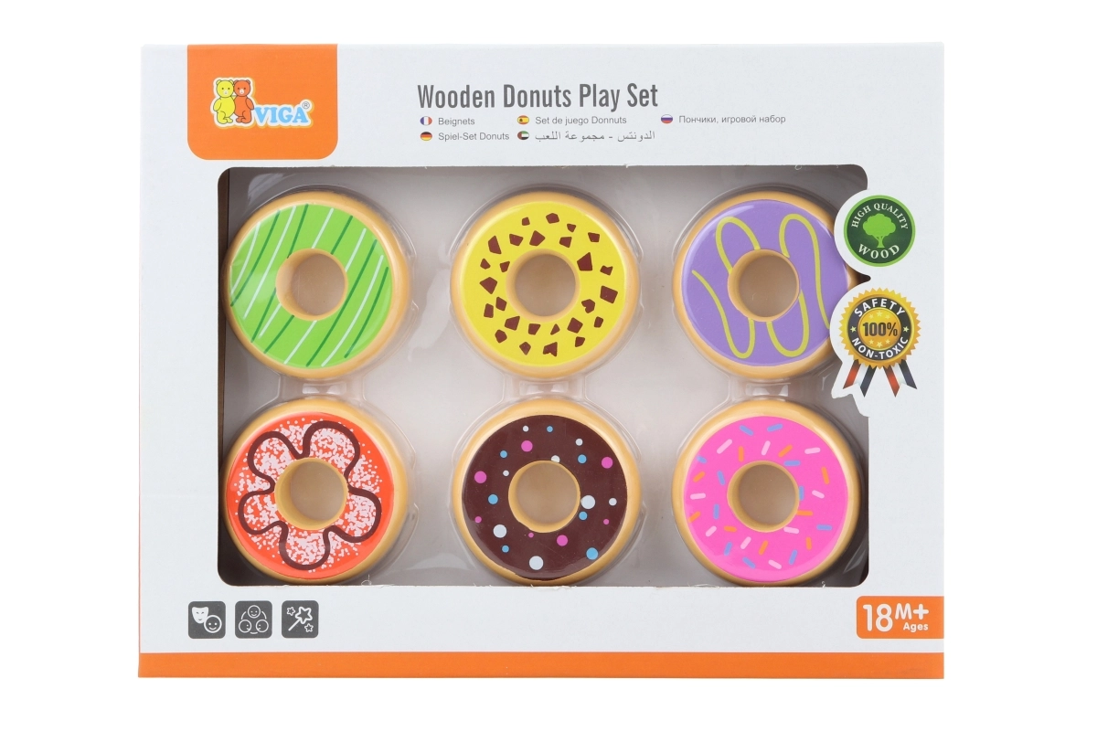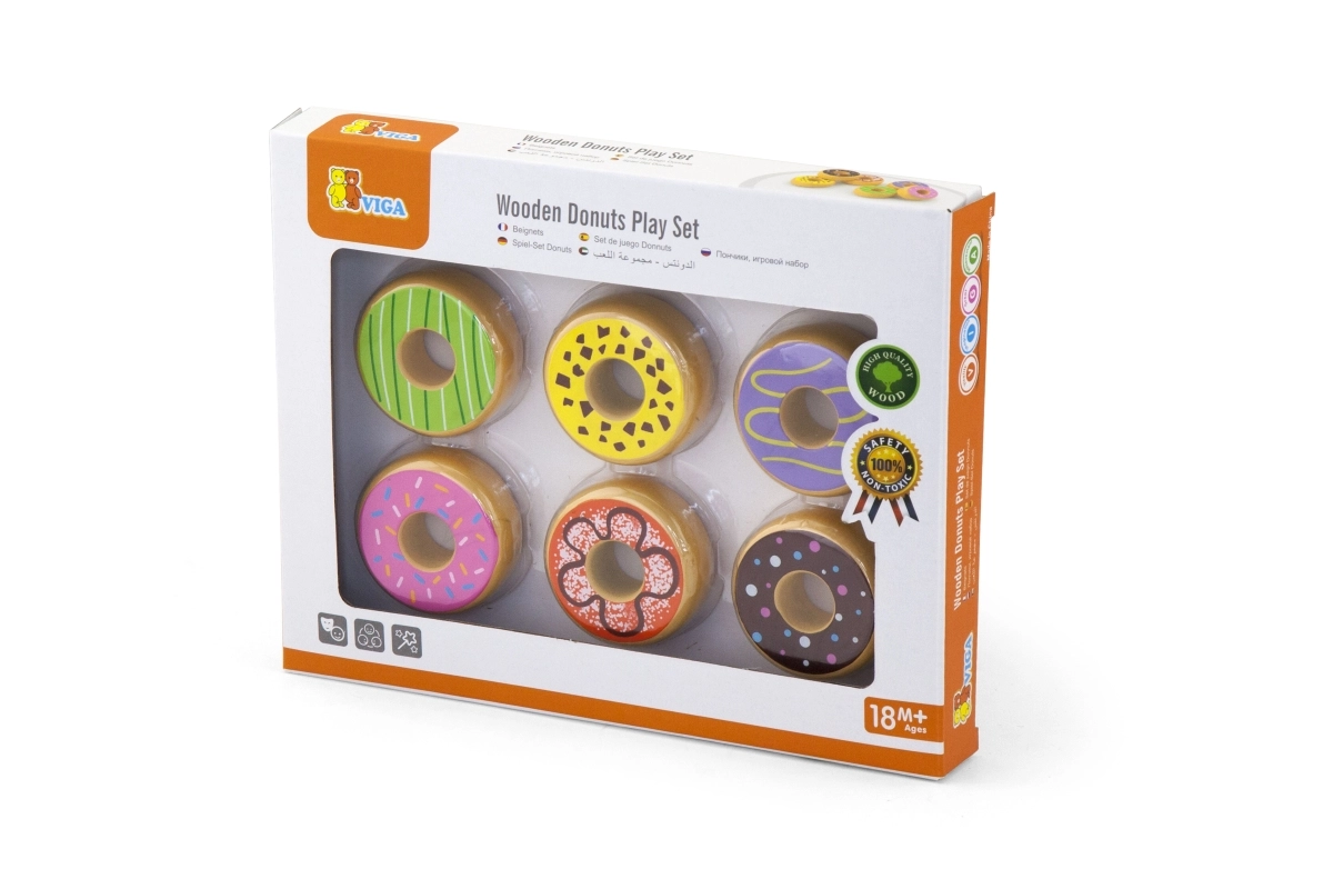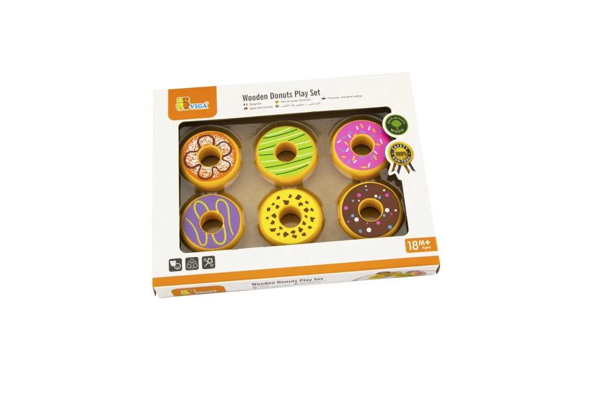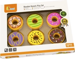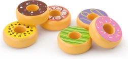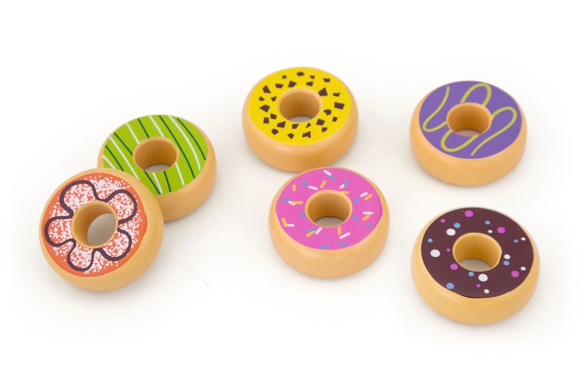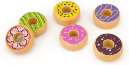 Игрив комплект от шест дървени понички за деца от 18 месеца, който подпомага фината моторика, фантазията и ролева игра на магазин или кафе. Всяка поничка има различна цветна украса и приятно гладка повърхност за безопасно боравене.