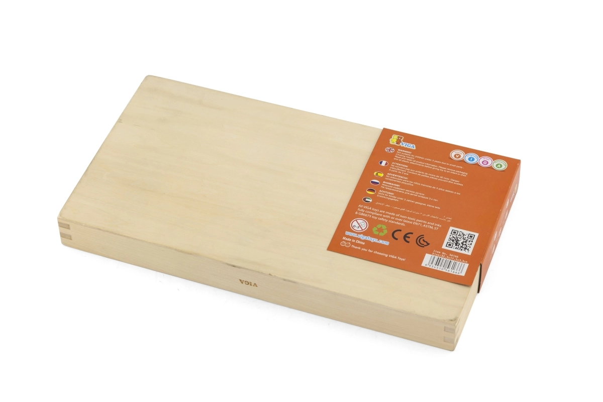 Пръчиците са от лакирано дърво и оцветени с безопасни бои. Здравата дървена кутия с отделения държи всичко на мястото му и улеснява прибирането след игра.