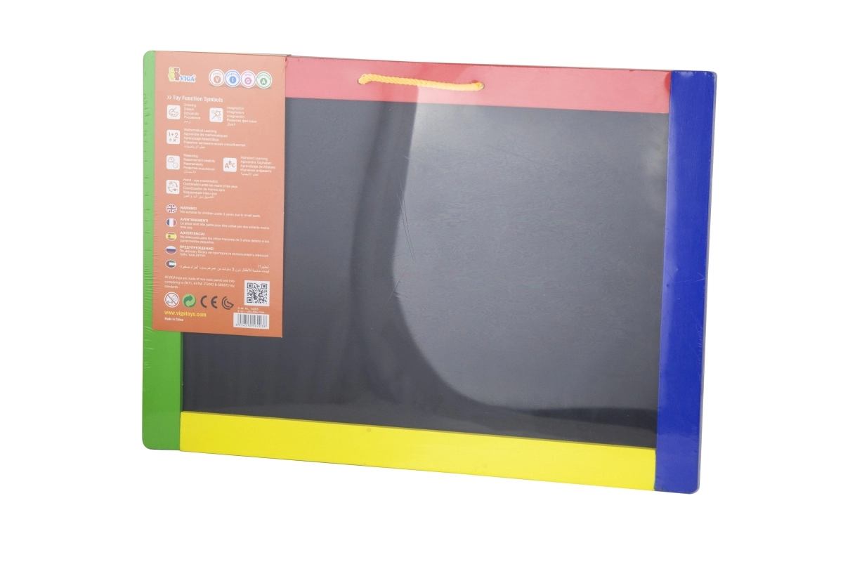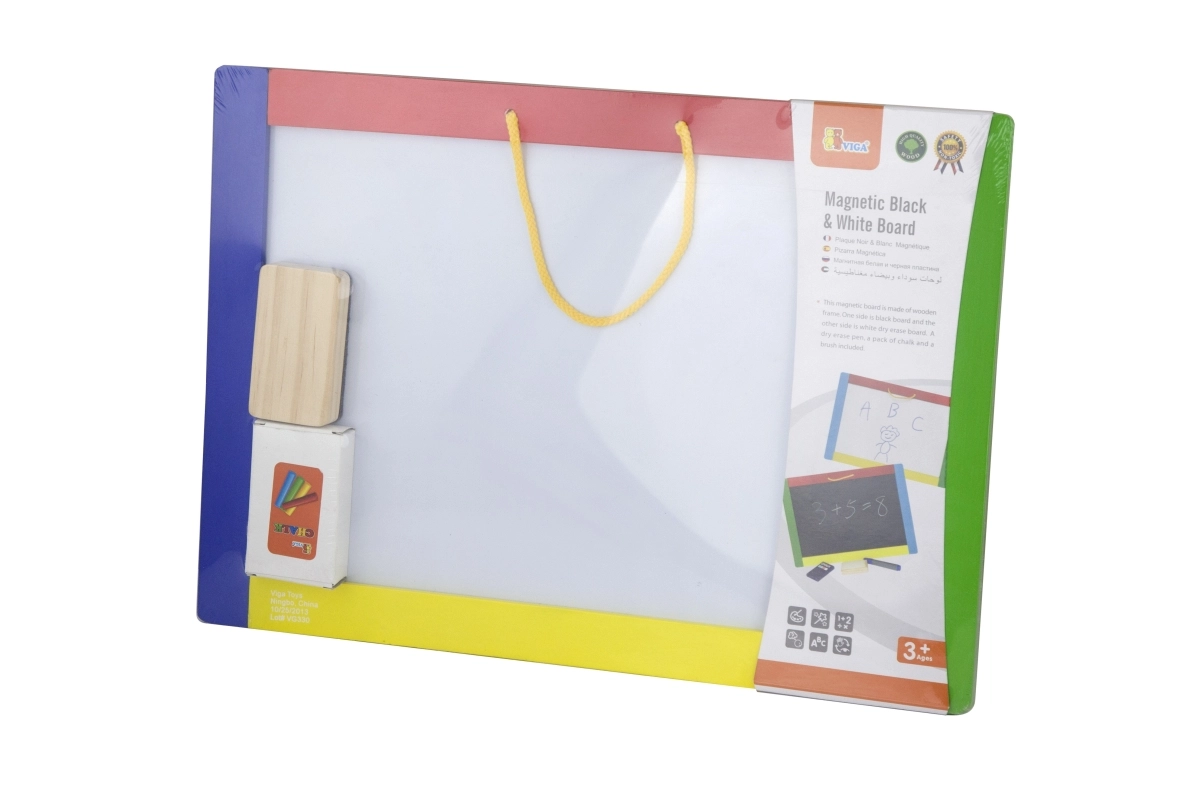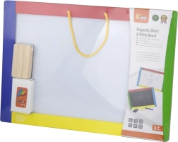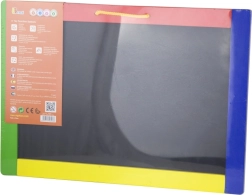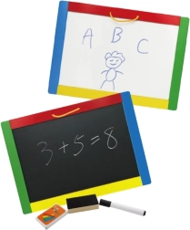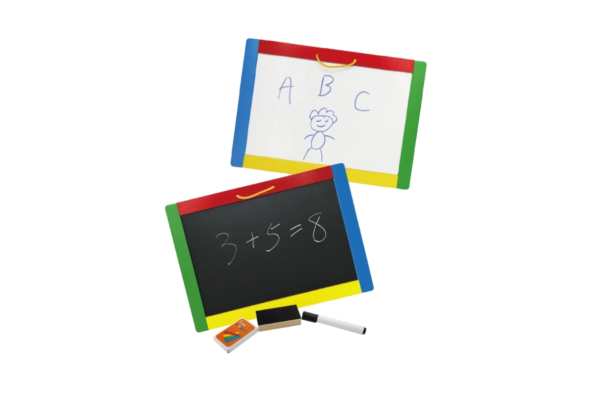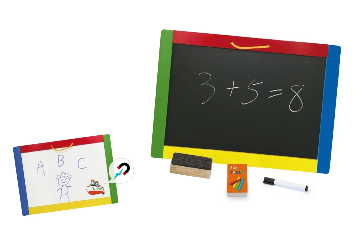 Тази универсална дъска съчетава две креативни повърхности в едно – черна магнитна страна за тебешири и бяла изтриваема страна за маркер. Децата могат да пишат, рисуват и тренират буквички и цифри; на черната страна лесно се закрепват магнити. В комплекта ще намерите всичко за незабавна употреба: 4 тебешира, изтриваем маркер и гъба.