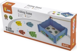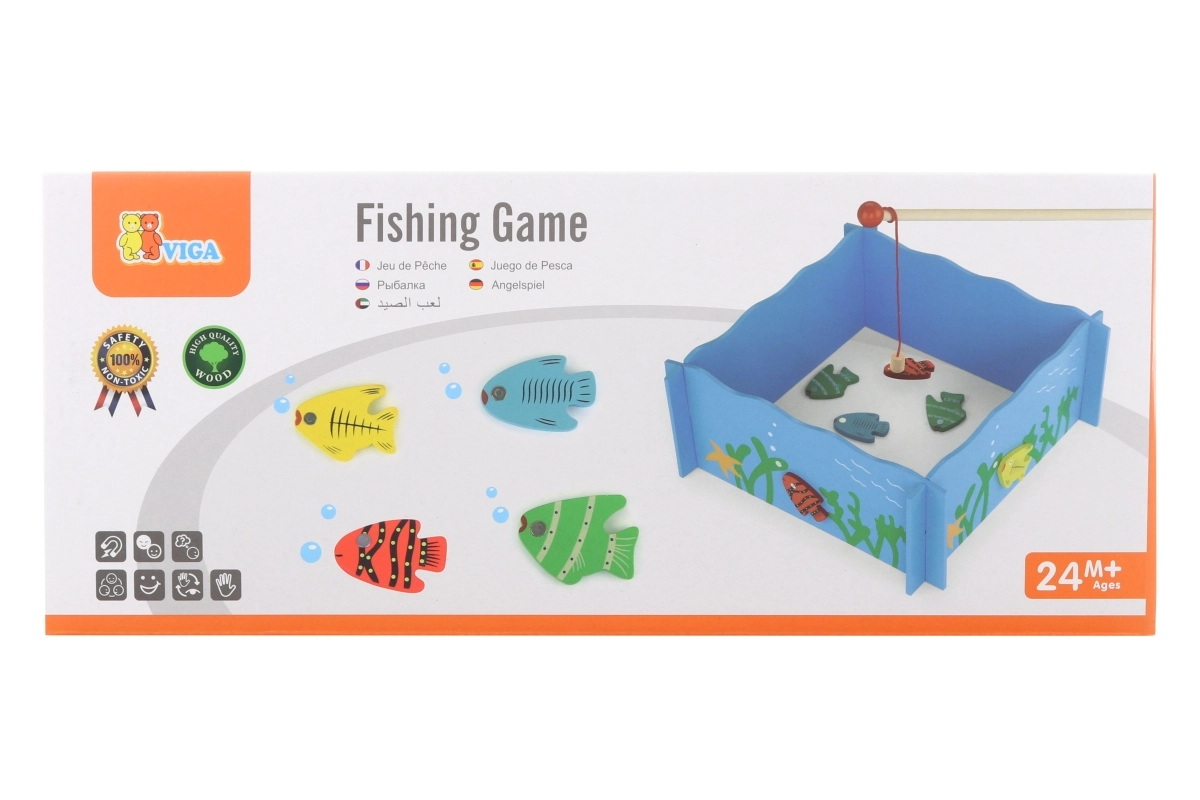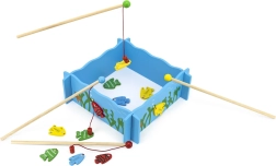 Забавната и качествена дървена магнитна игра Риболов развива фината моторика, координацията око–ръка и търпението на деца от 24 месеца. Съдържа рибарски басейн, 4 магнитни въдици и 20 цветни рибки с числа за учене и игра.