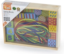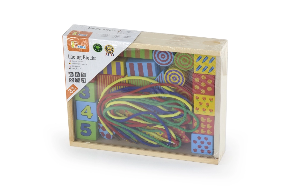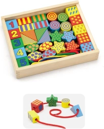 Открийте креативната игра с дървения нанизващ комплект VIGA – кутийка, пълна с цветни форми за нанизване на връвчици като мъниста. Подпомага фината моторика, координацията око–ръка и ученето на цветове и форми. Части от качествено дърво с нетоксични бои и голям размер за безопасно захващане.