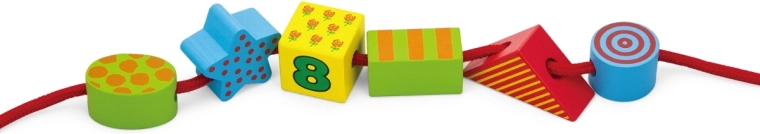 Този дървен нанизващ комплект предлага на децата безкрайни възможности за творчество: нанизване като мъниста, строене на комини и къщички или сортиране по цветове и форми. Големите елементи (около 4 см) се държат лесно и са идеални за първи моторни упражнения.