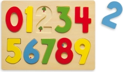 Пъстра дървена вложка с цифри 0–9 помага на децата да се учат на цифри, развива фината моторика, логическото мислене и координацията око–ръка. Здравата дървена изработка, приятните цветове и гладките ръбове осигуряват безопасна и забавна игра за деца от 3 години.