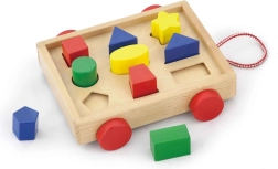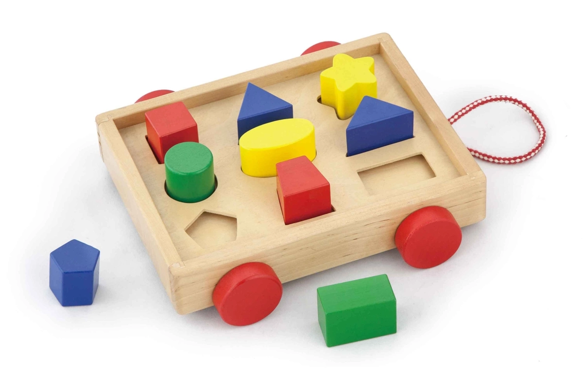 Дървената сортираща игра - количка е страхотна образователна играчка за деца от 24 месеца, която помага за развиване на разпознаване на форми и координация око-ръка.