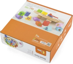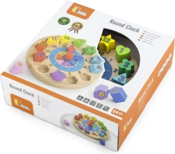Забавен и образователен дървен часовник за най-малките, който помага да се научат да разпознават времето, цветовете и формите. Съдържа 12 цветни вложки с числа, които развиват фината моторика, логиката и координацията око–ръка. Идеална играчка за деца от 24 месеца.