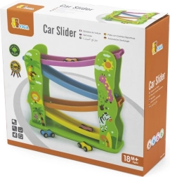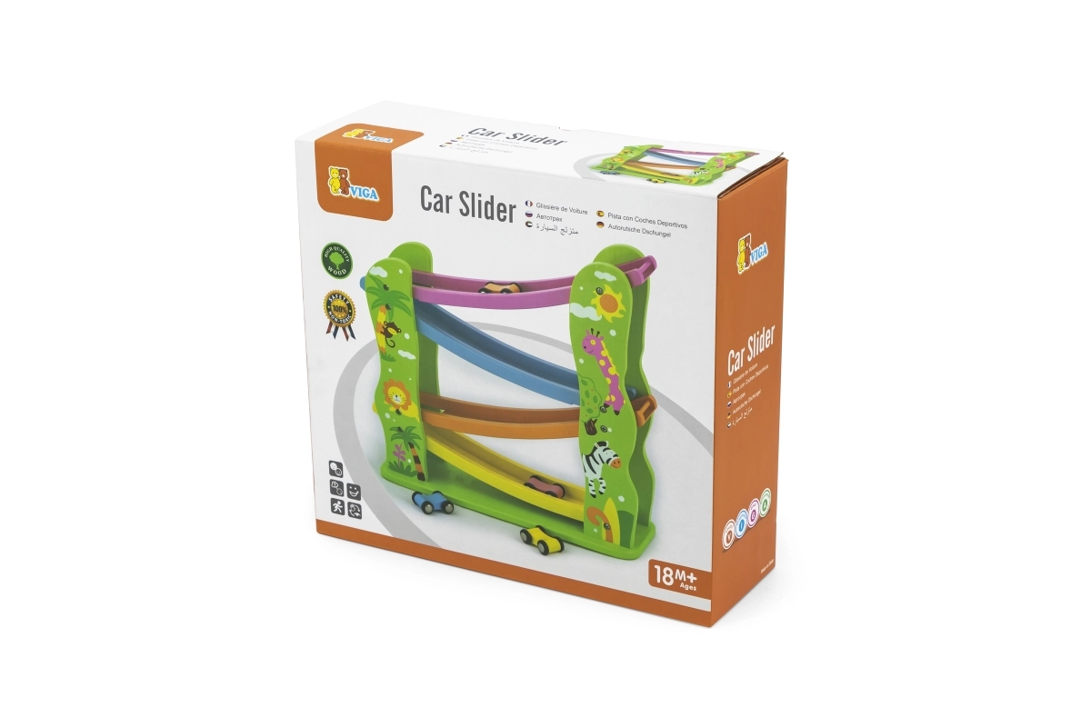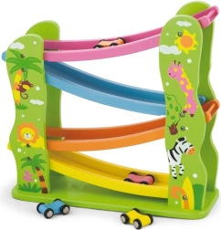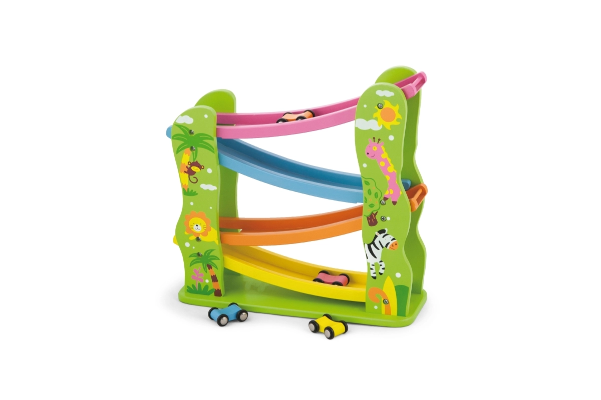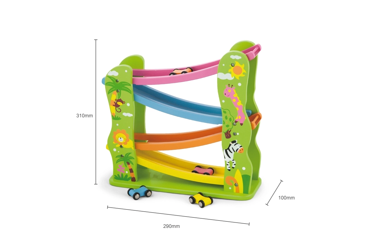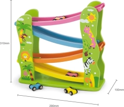 Тази красиво оцветена дървена пързалка е перфектна за вашите малчугани, които искат да се забавляват и едновременно да развиват своите способности. Съдържа рампа с няколко нива в различни цветове и позволява на количките да се движат плавно по пистата.