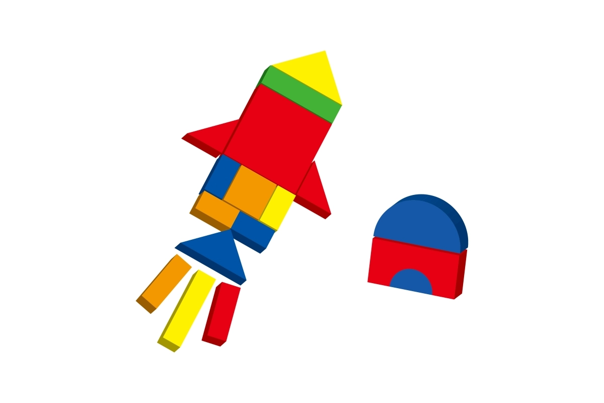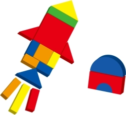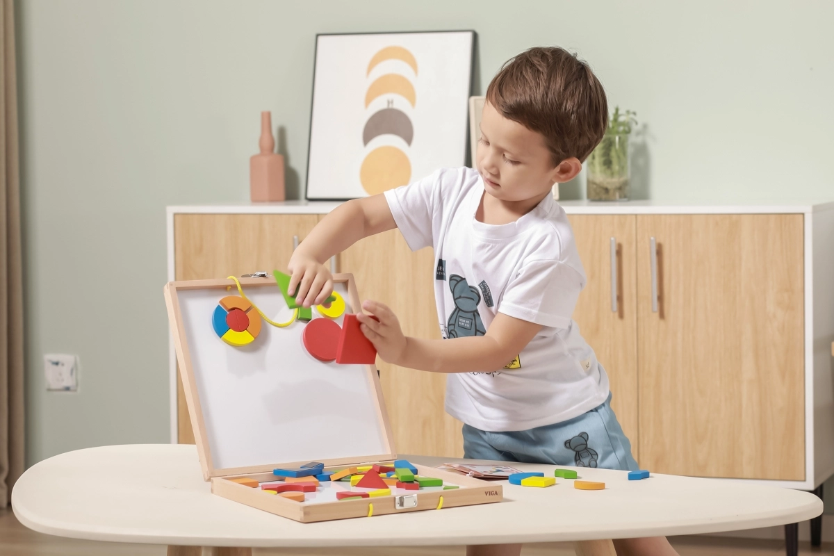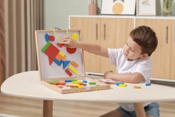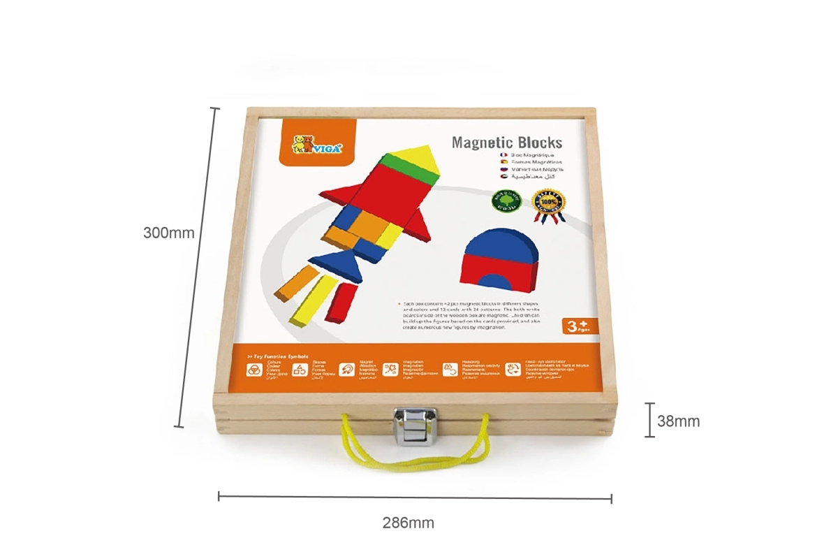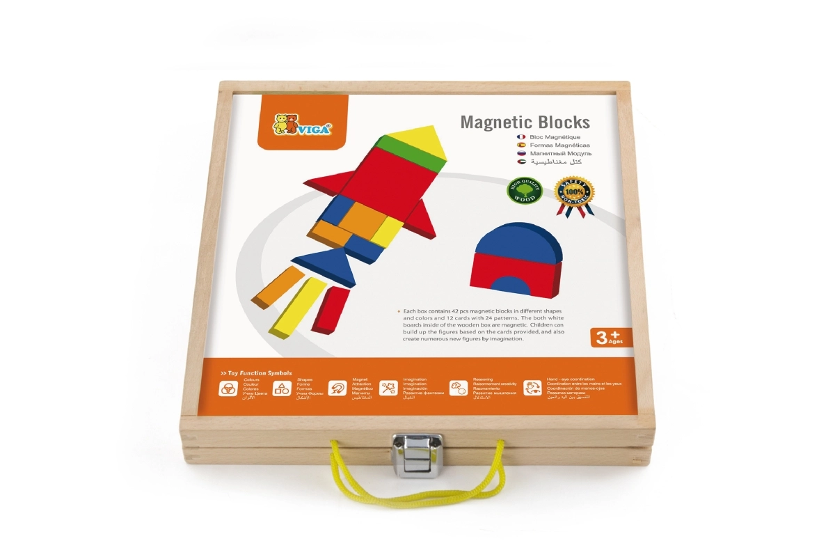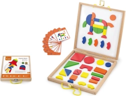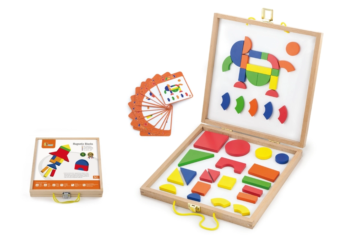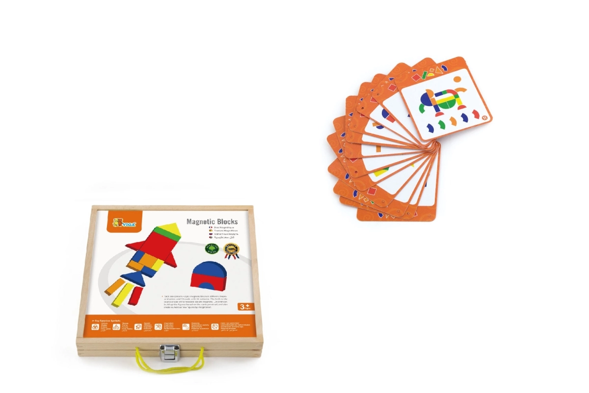 Комплектът включва 42 дървени магнитни части в различни форми и цветове, както и 12 двустранни карти с общо 24 оригинални шаблона за лесен старт. Докато играят, децата упражняват фината моторика, координацията око–ръка, възприемането на цветове и форми и пространственото мислене.