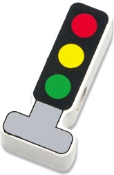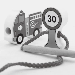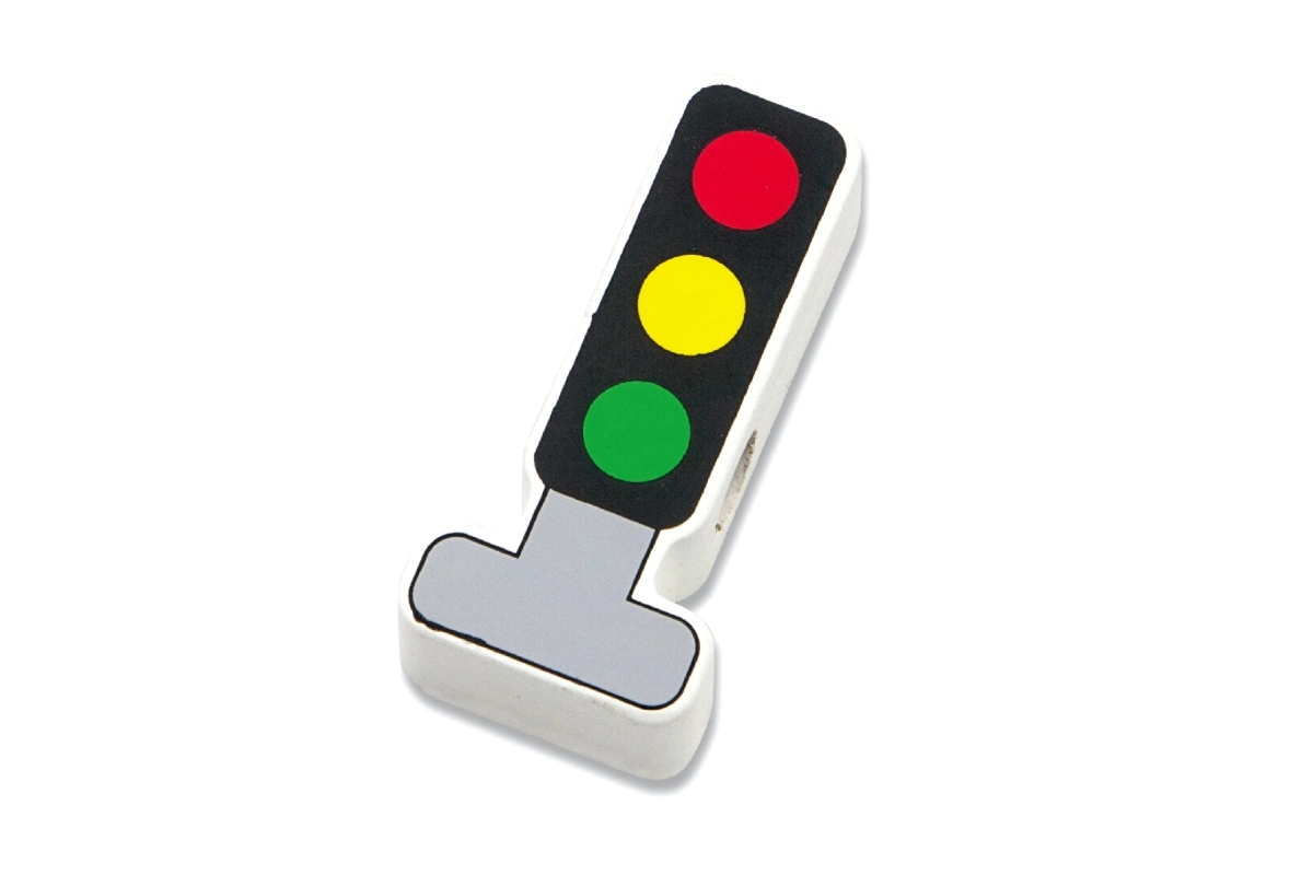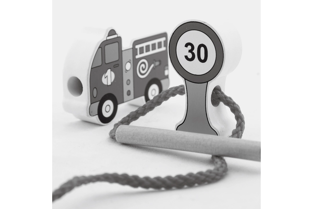 12 елемента и връвчица с дървена пръчица позволяват нанизване, подреждане и създаване на истории за градския трафик.