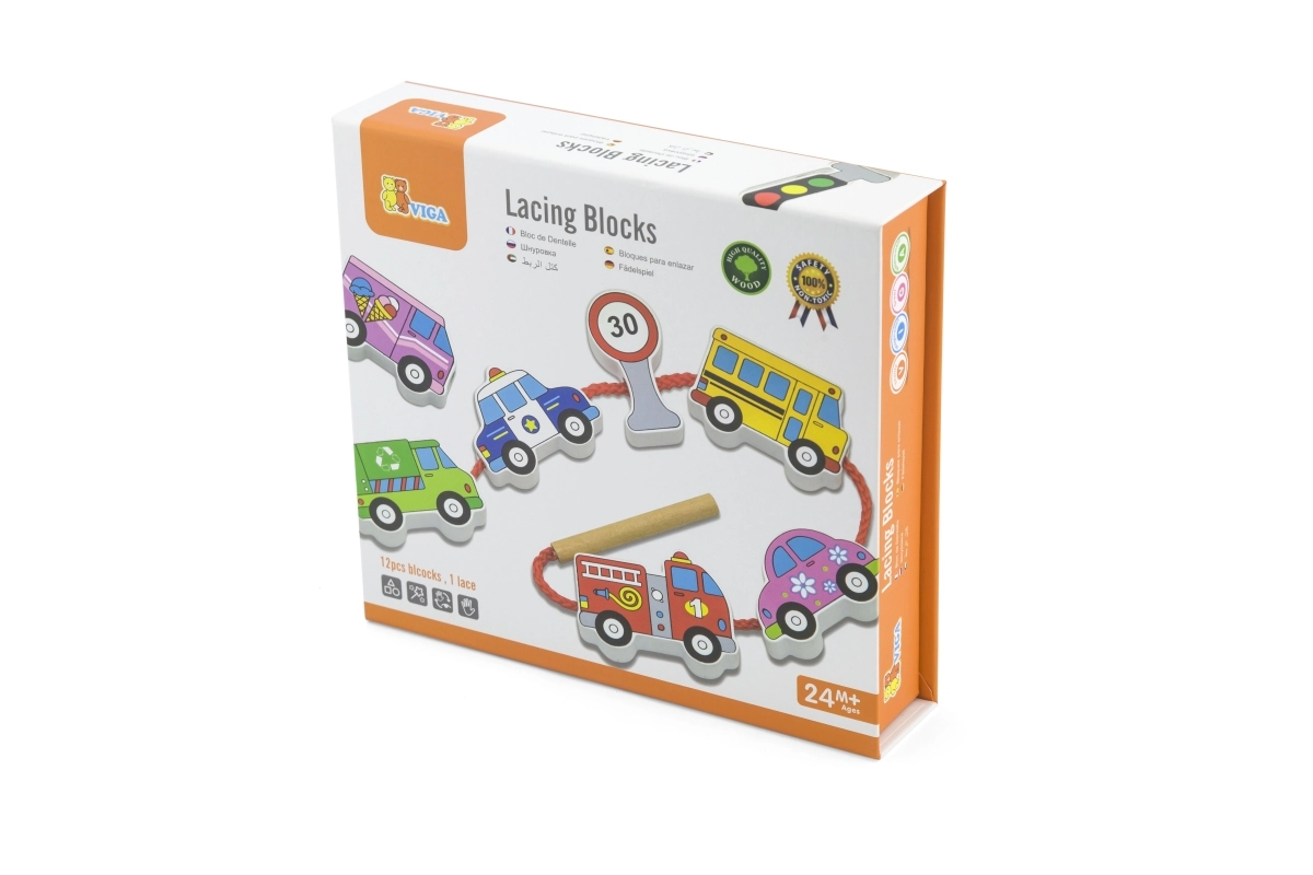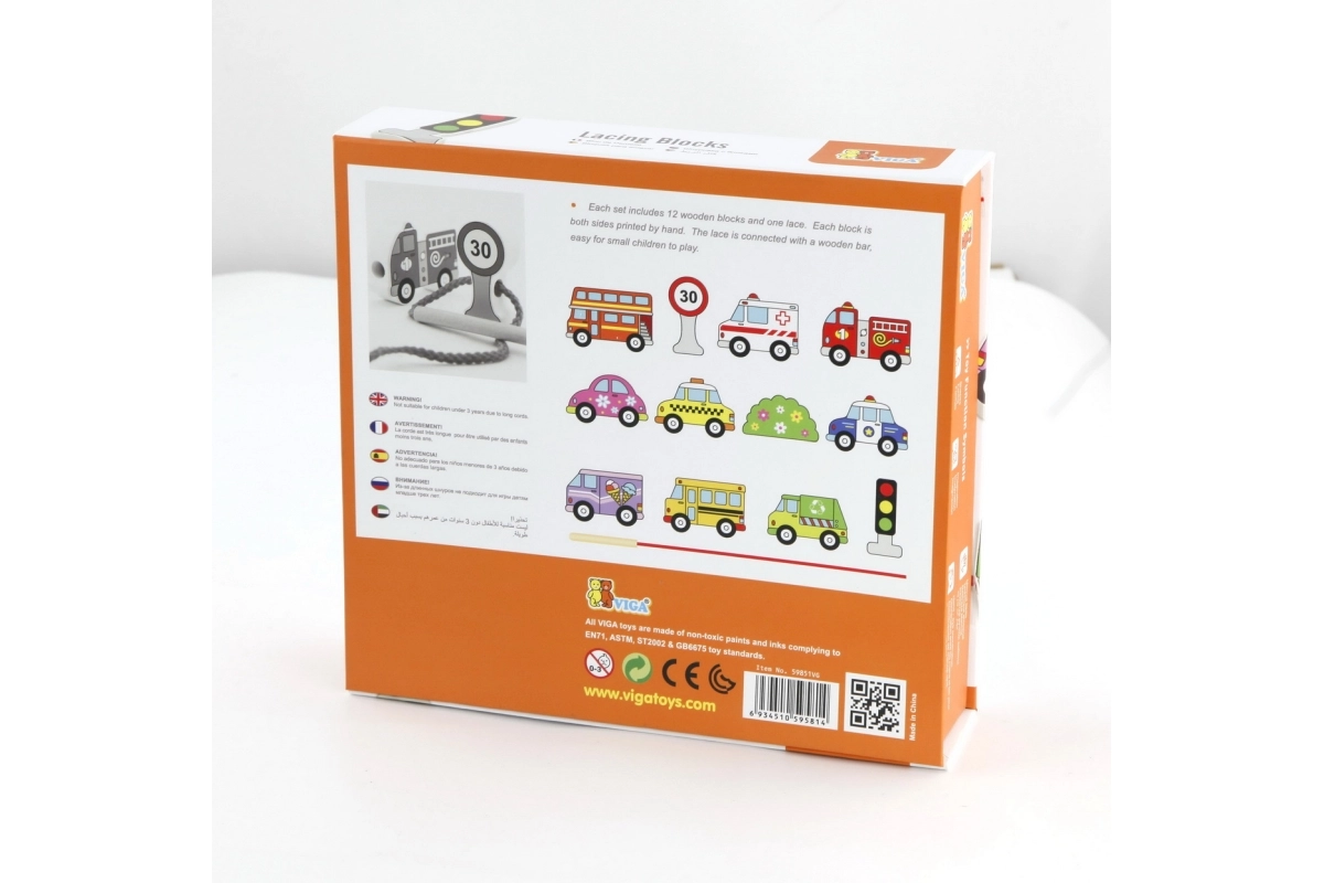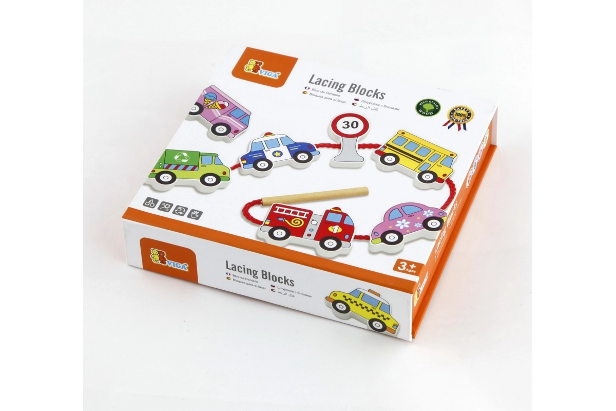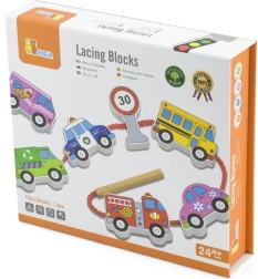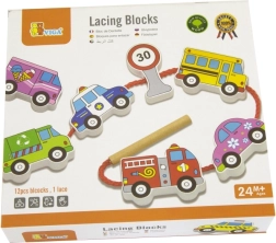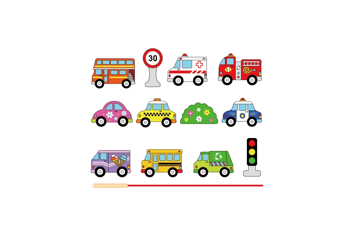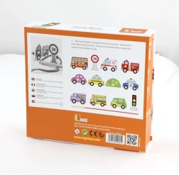 Този качествен дървен комплект за нанизване на превозни средства носи на децата радост от ученето чрез игра. Включва 12 двустранно рисувани елемента с автомобили, автобус, линейка, пожарен автомобил и пътни знаци, както и здрава връвчица с пръчица за лесно промушване. Децата могат да създават собствени истории за градския трафик, пътувания и безопасност на пътя.