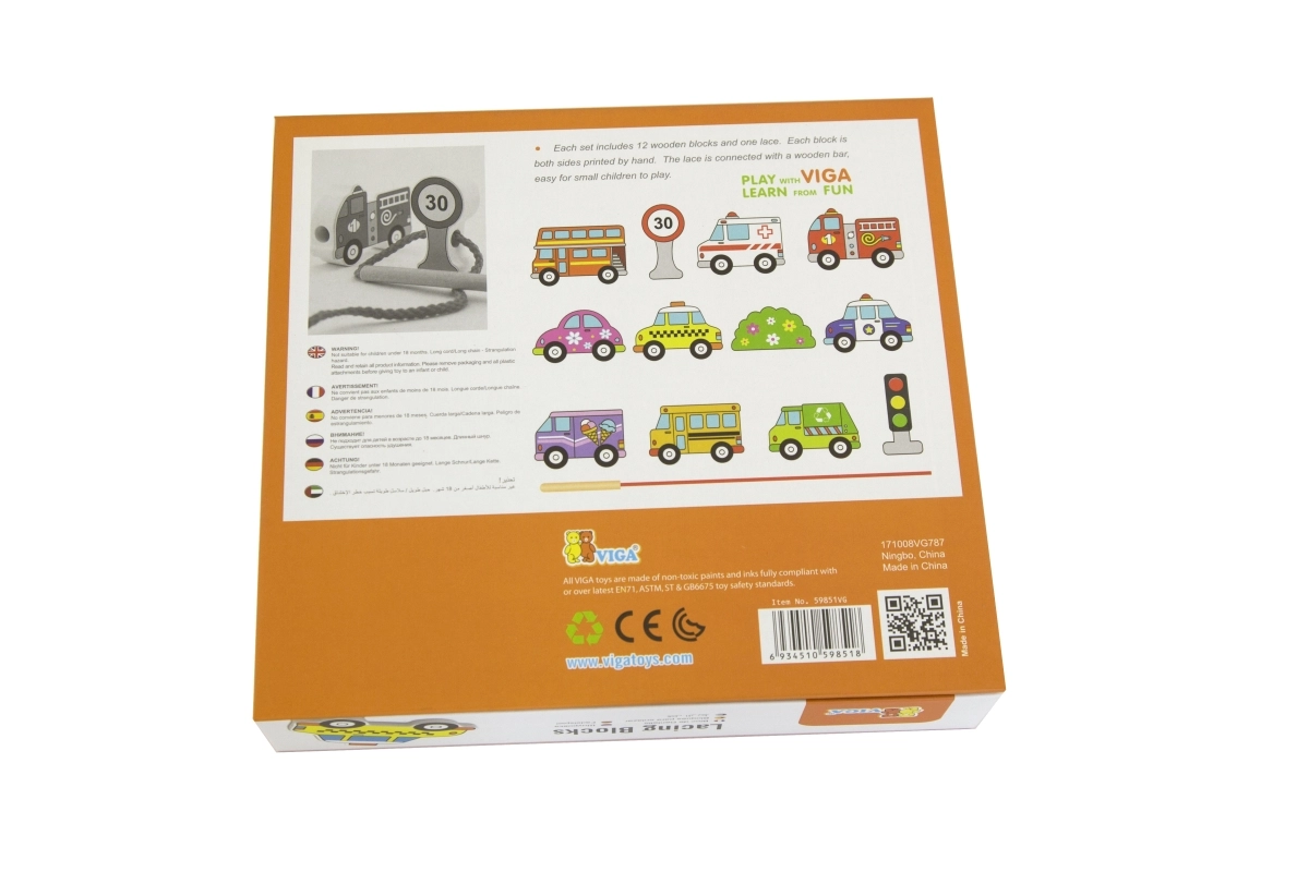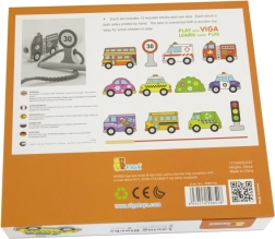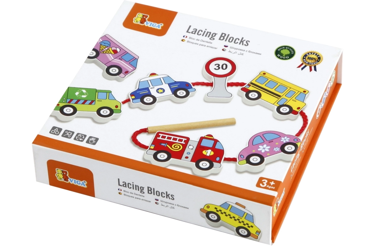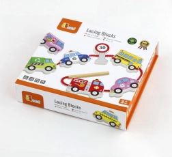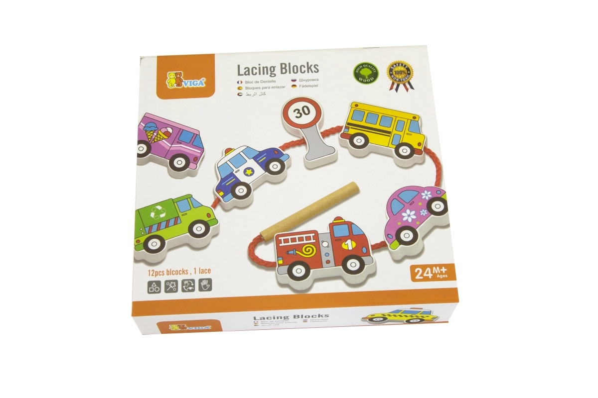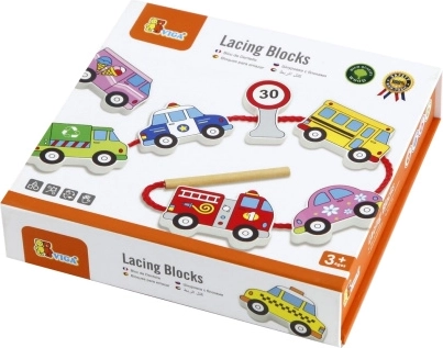 Този качествен дървен комплект за нанизване на превозни средства носи на децата радост от ученето чрез игра. Включва 12 двустранно рисувани елемента с автомобили, автобус, линейка, пожарен автомобил и пътни знаци, както и здрава връвчица с пръчица за лесно промушване. Децата могат да създават собствени истории за градския трафик, пътувания и безопасност на пътя.