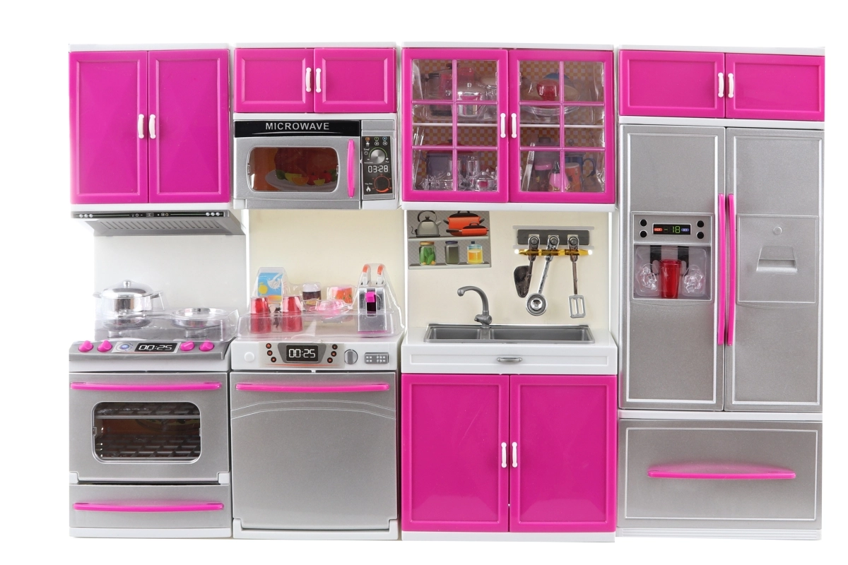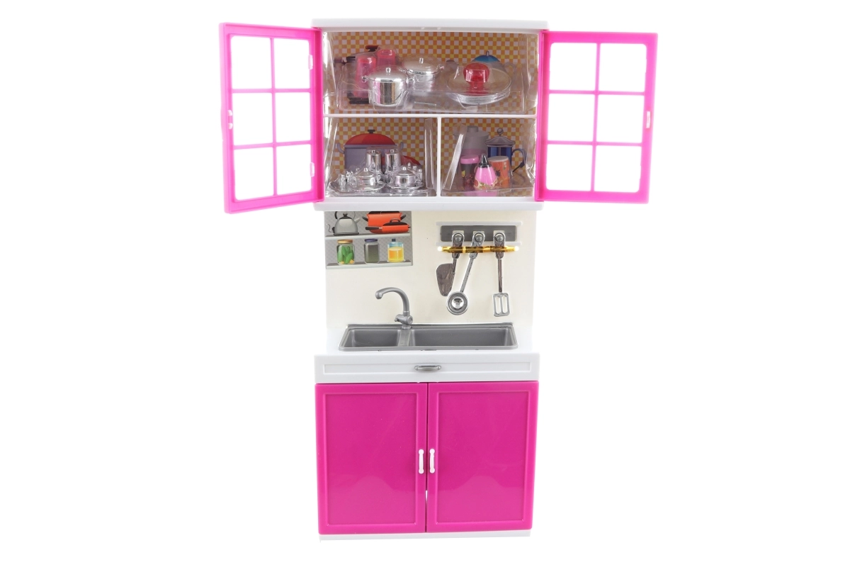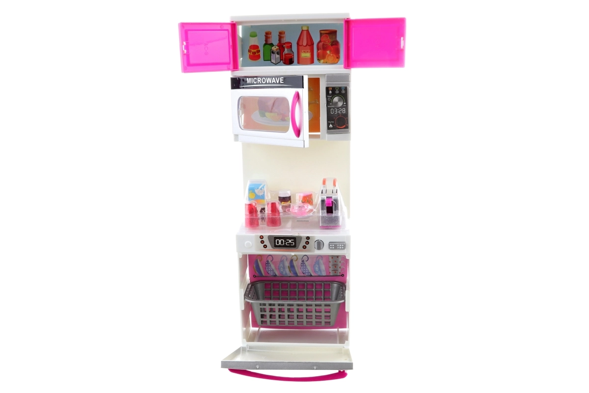 Тази стилна детска кухня в розово-бяла цветова гама предлага всичко необходимо за въображателна игра. Комплектът включва плот с котлони на батерии, микровълнова, хладилник, мивка, шкафчета и богати аксесоари. Благодарение на реалистичните елементи децата развиват фината моторика и въображението си.