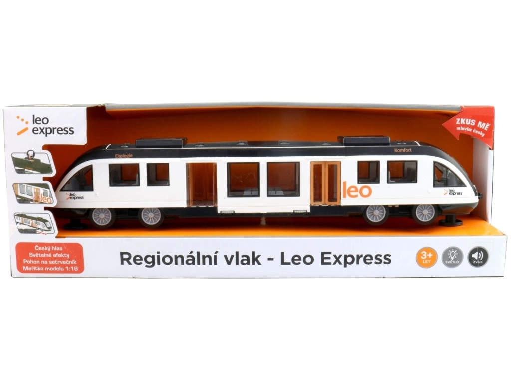 Стилният влак LEO EXPRESS носи на децата забавление, вдъхновено от истинската железница. Благодарение на съобщенията на чешки език и светлинните ефекти играта изглежда реалистично и развива въображението и моториката. Инерционното задвижване осигурява плавно потегляне и спиране без необходимост от релсов път.