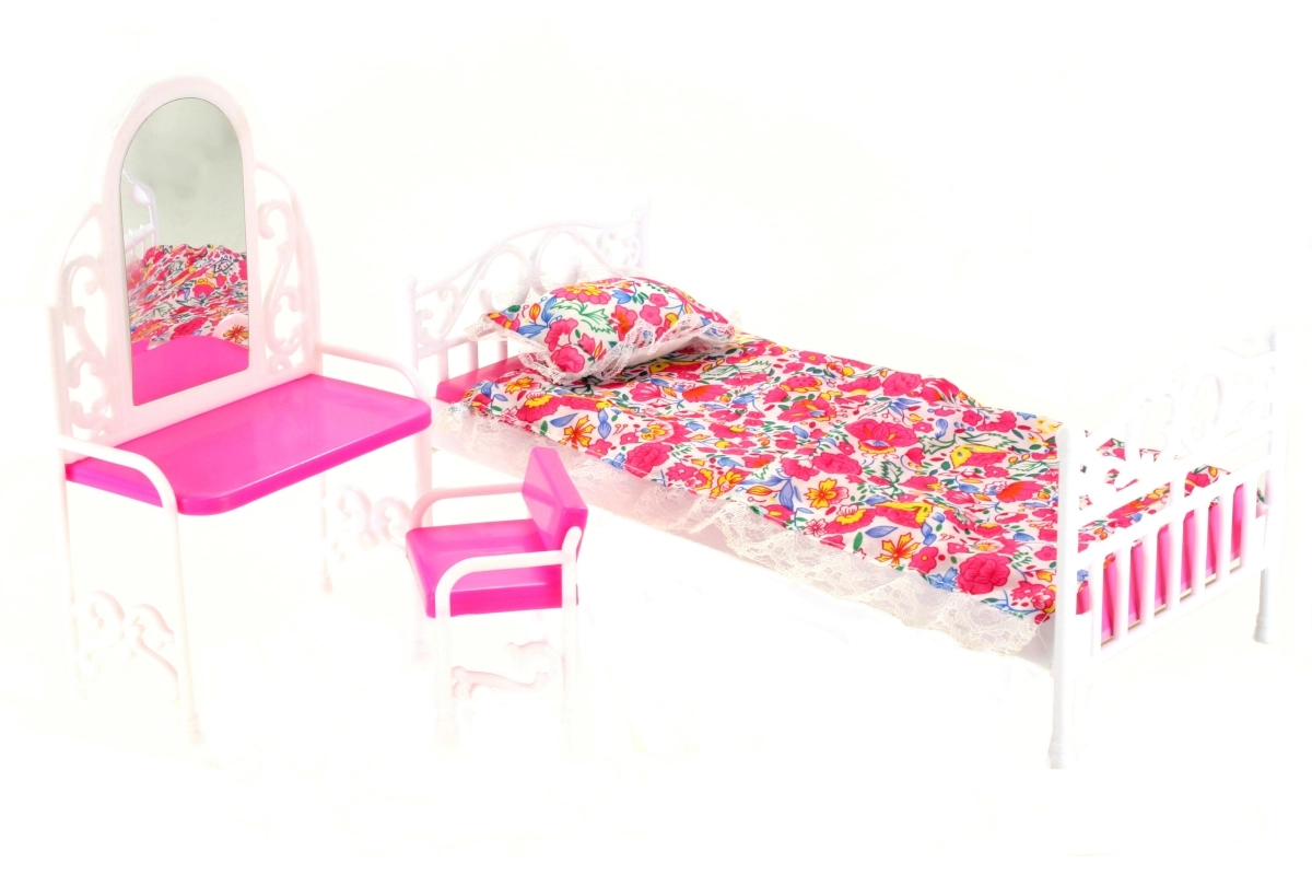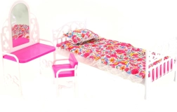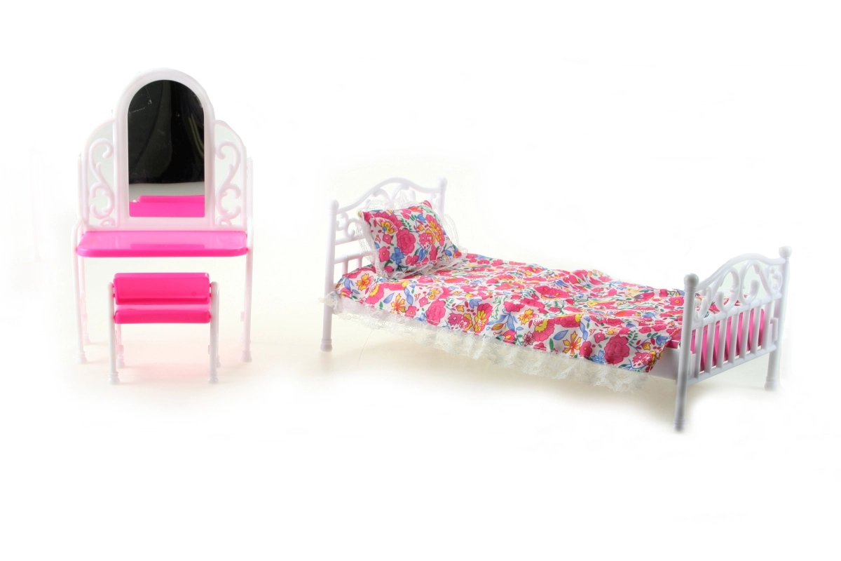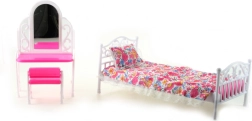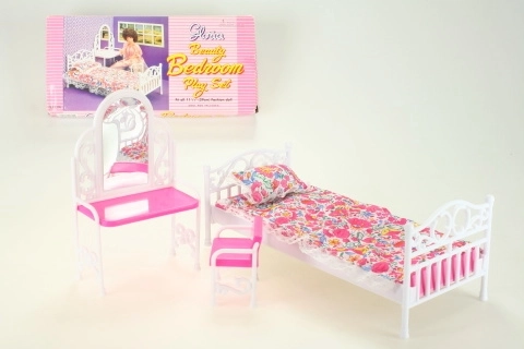 Открийте очарователния комплект Glorie, който включва легло за кукли с меко покривало и възглавничка, тоалетка с огледално фолио и практично столче. Подходящ за повечето стандартни кукли и допълва стаята им с уютно място за почивка и приготвяне.