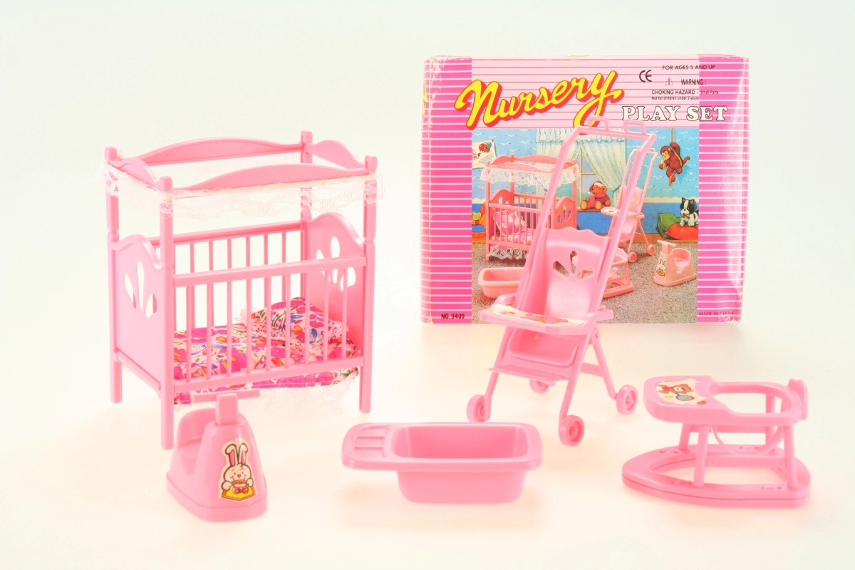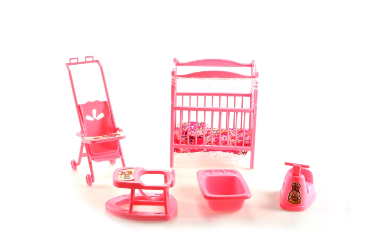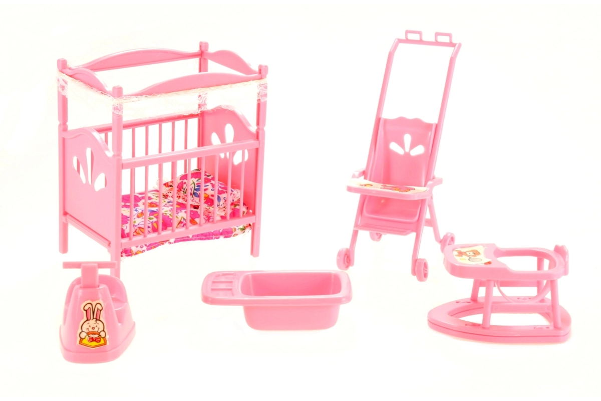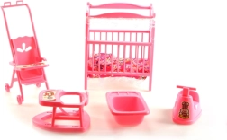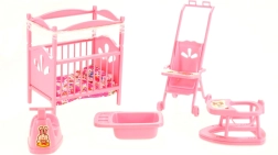 Комплектът за детската стая за кукли GLORIE ще зарадва всеки малък грижещ се. В него ще откриете кошарка с юрганче и възглавничка, количка, проходилка, гърне и ваничка – всичко изработено от устойчив пластмасов материал и с размери, идеални за игра. Чудесен за развитие на фантазията и ролева игра. Подходящ за деца от 3 години.