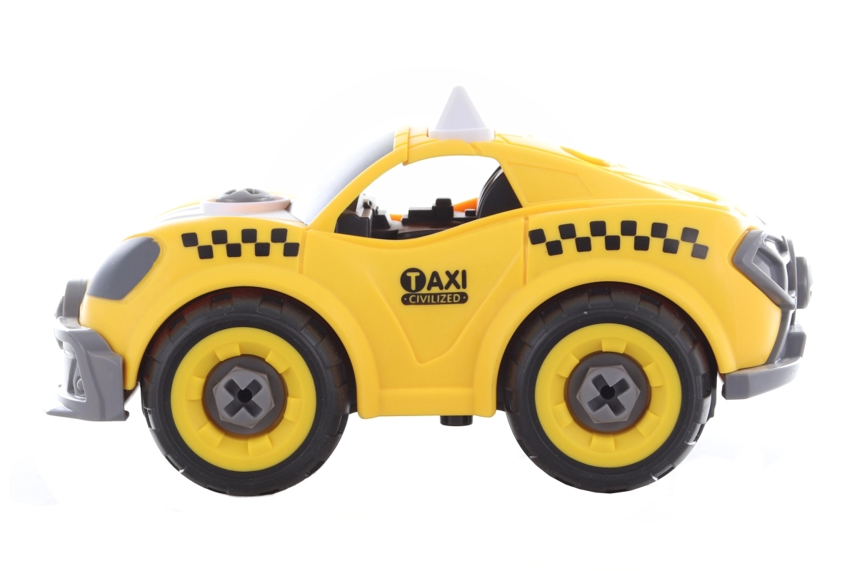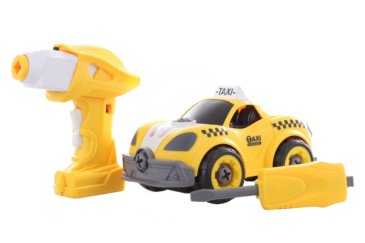 Построй, завинти и тръгвай! Този креативен комплект съчетава винтов модел на жълто такси с възможност за преобразяване в кола с дистанционно управление. Децата първо сглобяват колата с отвертка или бормашина, след това изваждат моторчето от бормашината, поставят го в колата и се наслаждават на лесно управление напред и назад.