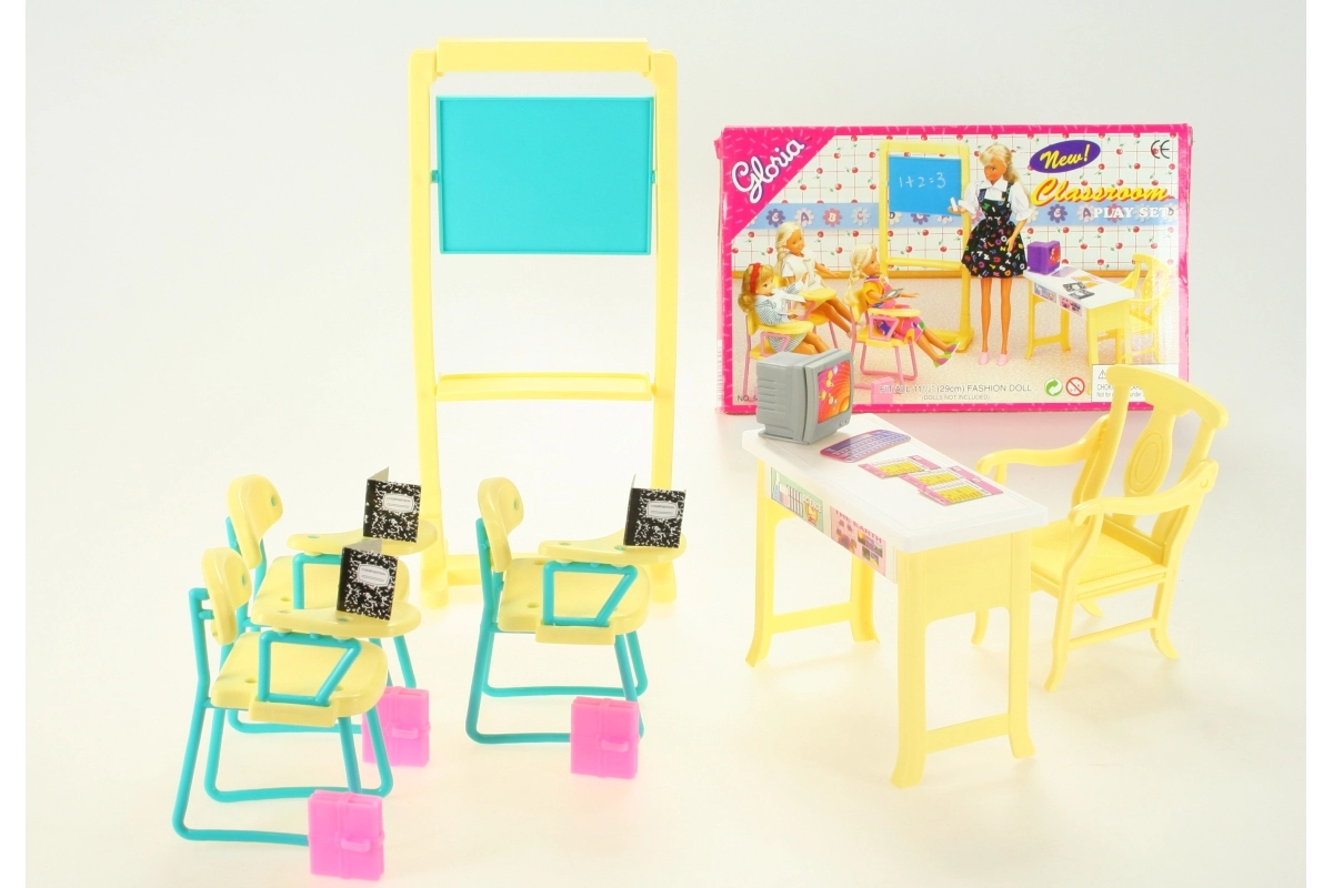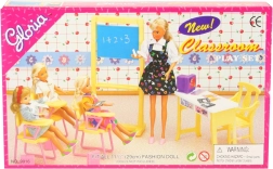 Създайте у дома собствена училищна атмосфера с комплекта Glorie училищна класна стая. Този богато оборудван сет предлага дъска, учителско бюро и стол, 3 стола с подлакътници, компютър с клавиатура, чанти и хартиени тетрадки и тестове. Идеален за креативна игра и развитие на въображението на децата. Куклите не са включени в комплекта.