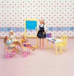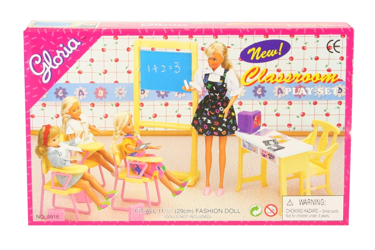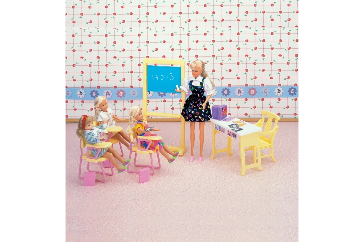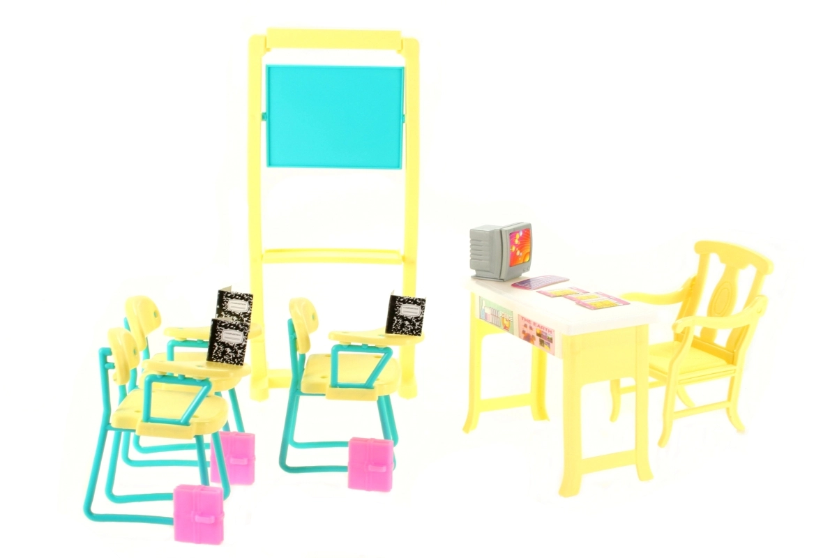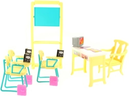 В комплекта са включени просторна дъска, учителски кът с компютър и столове за ученици. Благодарение на компактните размери сетът е съвместим с обичайните кукли и се съхранява лесно.