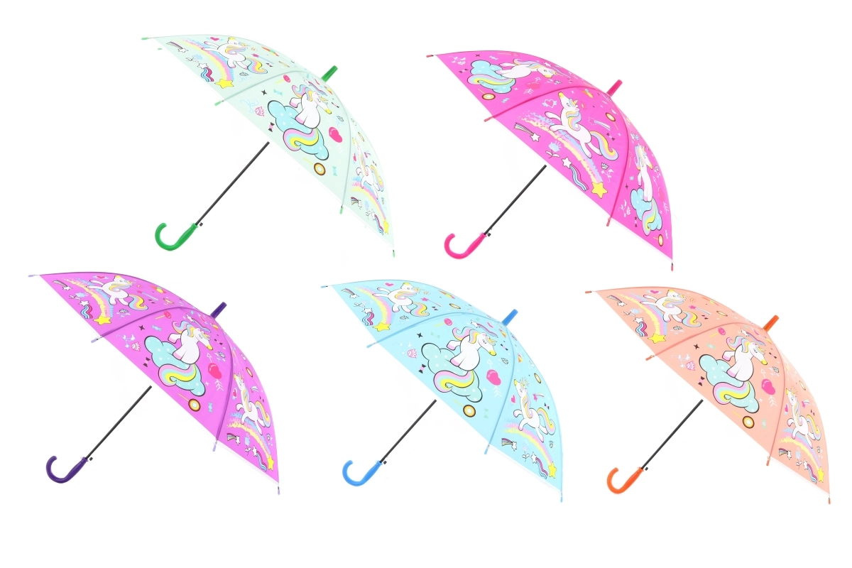 Сладък детски автоматичен чадър с мотиви на еднорози ще зарадва както по-малките, така и по-големите деца. Предлага здрава стоманена конструкция, удобна пластмасова дръжка и лесно затваряне с лента с тик-так копче. Отлично предпазва от дъжд и благодарение на веселия дизайн ще озари всеки мрачен ден.