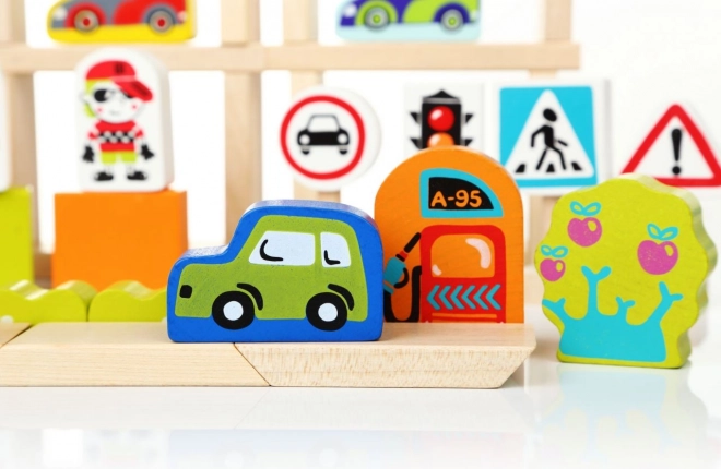 Транспортният конструктор в града ще впечатли децата с комбинацията от цветни дървени блокчета, които могат да подредят в оживен град, пълен с коли, светофари и бензиностанции. Отличен за развитие на сензомоторните умения, творческото мислене и логическите способности.