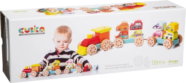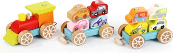 Този цветен дървен пъзел съдържа 14 елемента, от които децата могат да сглобят влакче с два вагона и осем колички. Те не само играят с отделните части, но и развиват своите сенсомоторни способности, логическо мислене и креативност.