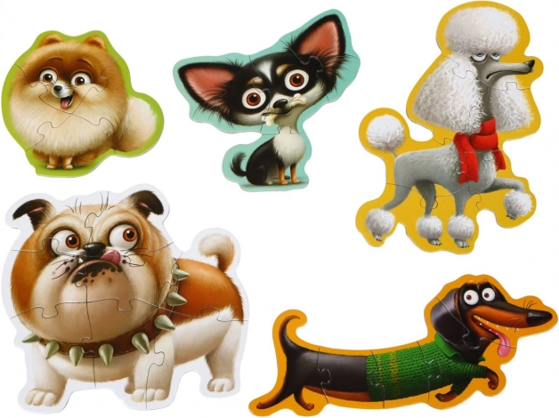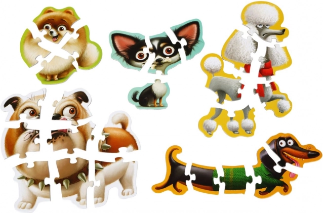 Този комплект детски пъзели Puzzlika предлага 5 очарователни изображения на кучета, които децата подреждат от части с различна трудност (4–8 на картинка). Благодарение на големите и здрави елементи пъзелите се държат отлично в малките ръчички и подпомагат концентрацията и търпението.