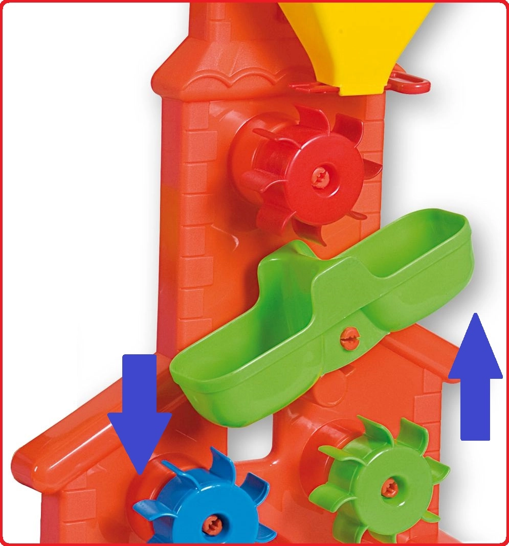 Тази издръжлива мелничка е чудесен спътник както на пясъчника, така и край водата. Децата могат да сипват пясък или да наливат вода във широката фуния с регулиране и да наблюдават как трите цветни колела оживяват и се въртят. Разделителният улей помага да се насочва потокът и насърчава експериментирането.