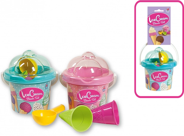 Очарователен детски комплект за пясък в стил сладолед ще зарадва всеки малък строител. Съдържа кофа с капак във форма на чашка, лъжица за сладолед и 2 фунийки. Произведен в Италия от качествена пластмаса, идеален за деца от 12 месеца. Лек, компактен и чудесен за пясъчника и плажа.