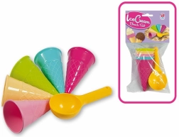 Androni формички за пясък Сладолед са идеални за малките любители на пясъка и сладоледа. Този шестчастов комплект предлага пет фунийки и практична лъжичка за топки, което позволява на децата да създават свои собствени пясъчни сладоледени деликатеси.