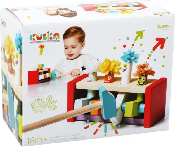 Дървена чукалка с изскачащи клоуни от марката CUBIKA превръща играта в забавно учене. Децата удрят с чукчето цветните елементи и наблюдават как клоуните изскачат – това отлично развива фината моторика, координацията око–ръка и логическото мислене. Изработена от явор и бук, с безопасни бои на водна основа и европейско производство.