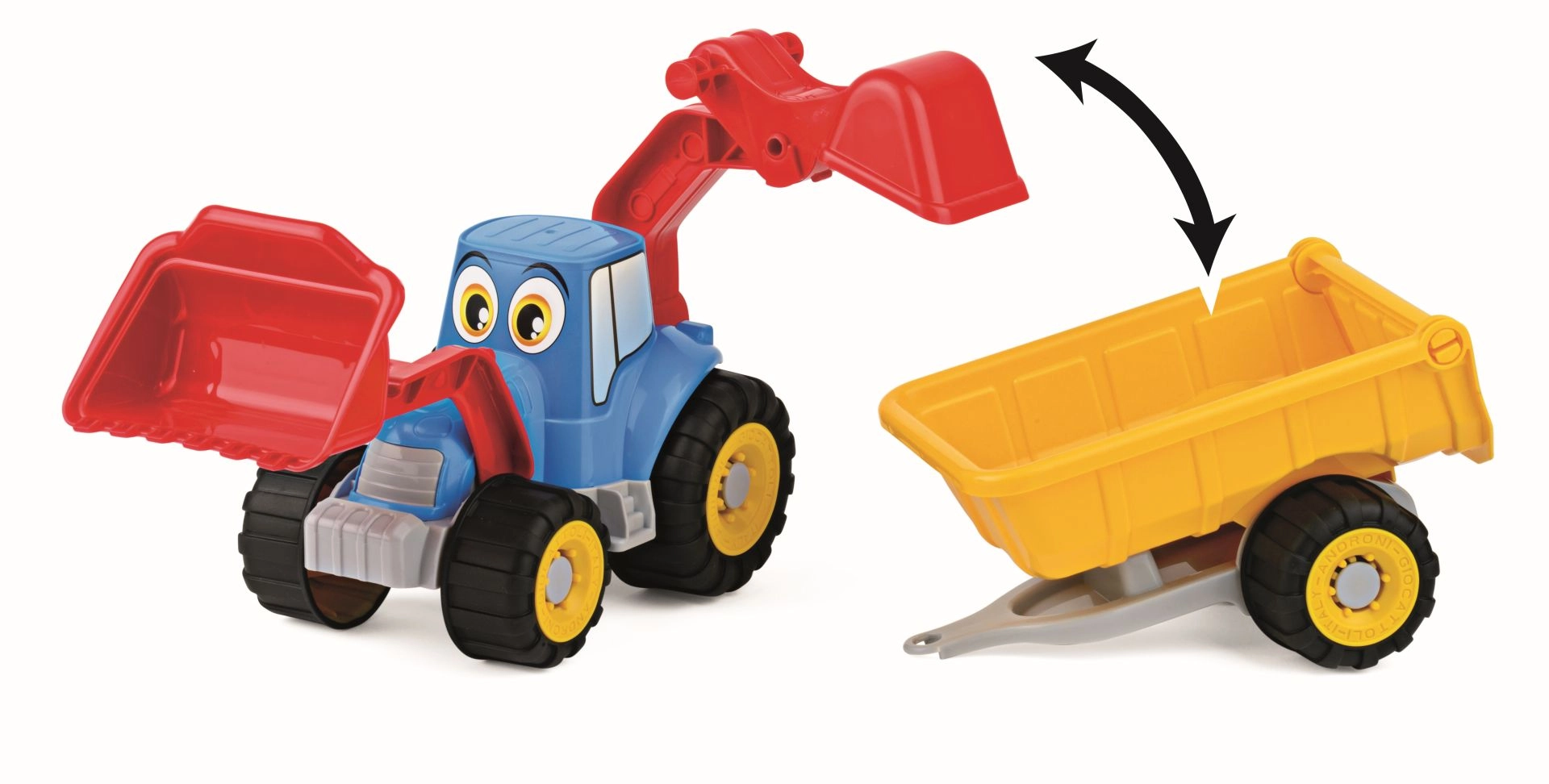 Пъстър детски трактор с товарач, заден багер и ремарке ще зарадва малките шофьори от 12 месеца. Има гуменирани колела за по-добро возене, падащ заден борд на ремаркето и е изработен от висококачествени италиански пластмаси. Дължината от 55 см гарантира отлична стабилност и много забавление у дома и в двора.