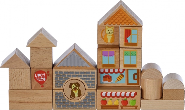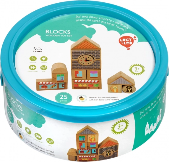 Открийте магията на креативното строене с дървения комплект Lucy & Leo град. Комплектът съдържа 25 висококачествени дървени части, включително 2 подвижни колички, различни форми и цветове за изграждане на къщички и улички. Илюстрирани елементи като прозорци, покриви и витрини на магазини стимулират въображението и тематичната игра. Играчката подпомага фината моторика, логическото мислене и креативността, а след игра лесно се прибира в практична кръгла кутия с капак и дръжка.