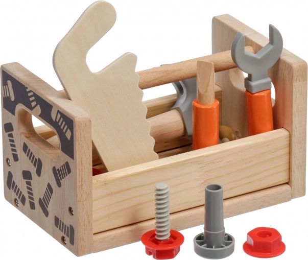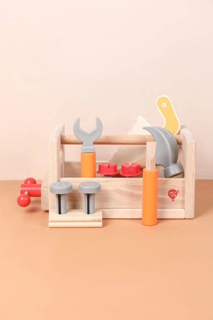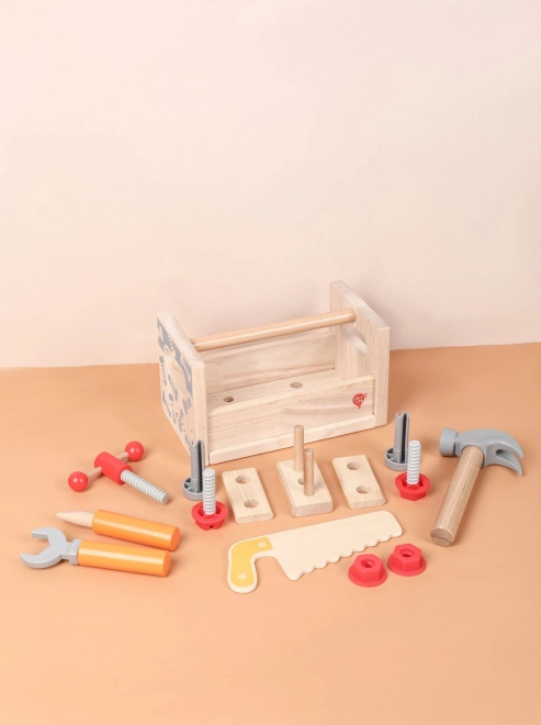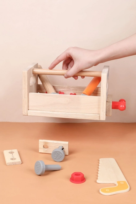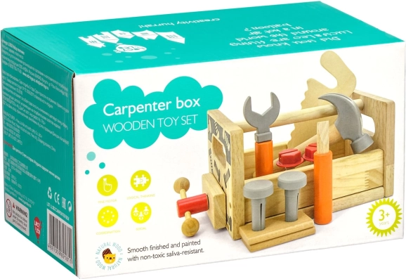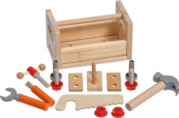 Част от комплекта е разнообразен детски инструментариум: чук, трион, отвертка, ключ, винтове и гайки, менгеме и гладки дървени елементи с отвори. Всичко има своето място, така че децата се учат на ред и основни техники за работа със свързващи елементи. Играта подпомага креативните строителни игри, координацията око–ръка и търпението.