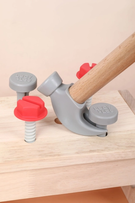Чук, трион, отвертка, ключ, винтове, гайки, менгеме и дървени елементи с отвори – всичко за реалистична игра и обучение.