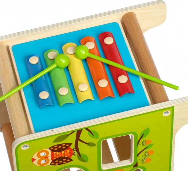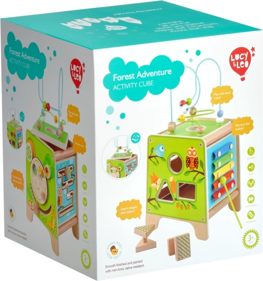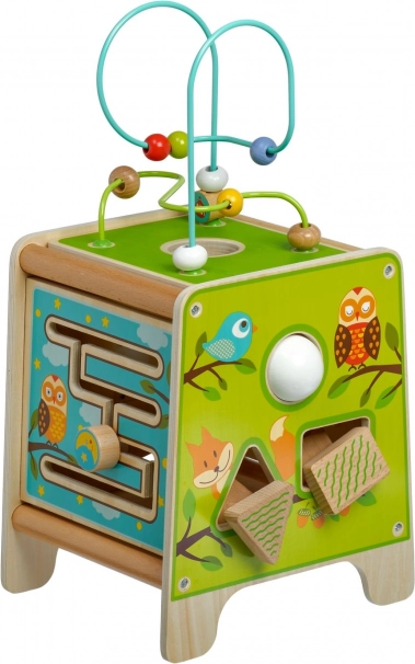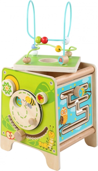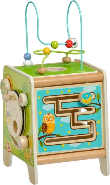 Това цветно дървено активно кубче носи на децата часове смислена игра. Горният мъниест лабиринт може да се извади и обърне навътре за лесно прибиране. По страничните стени децата ще открият ксилофон с палки, сортер с двуделни въртящи се геометрични форми, моторен лабиринт, въртящо се колелце, ротационни елементи и забавна игра с преместване на колче в каналче.