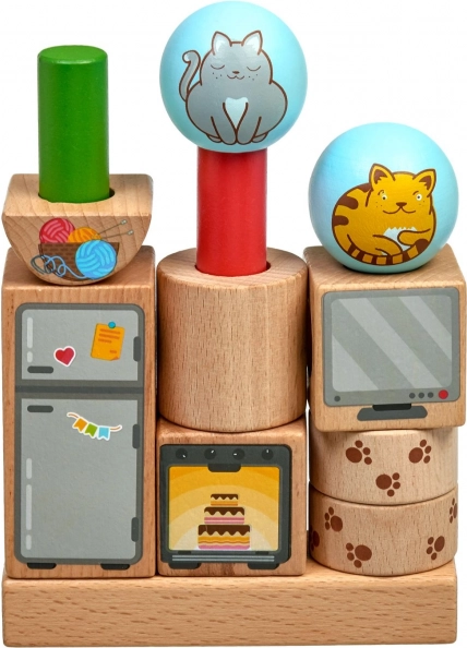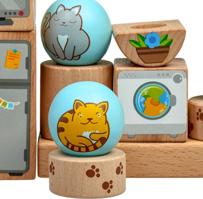 • Здрави дървени елементи с весели илюстрации на котки и домашен интериор