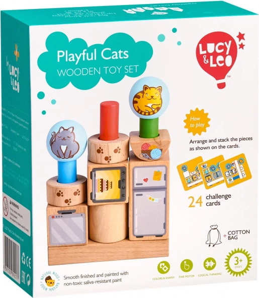 Открийте креативния дървен пъзел Игриви котки от Lucy & Leo, който развива логическо мислене, фината моторика и въображението. Децата подреждат цветни геометрични форми с мотиви на котки и мебели върху колчета според 24 шаблона. След игра всичко лесно се прибира в ленена торбичка – идеална образователна играчка, пълна със забавление и учене.