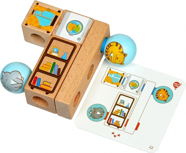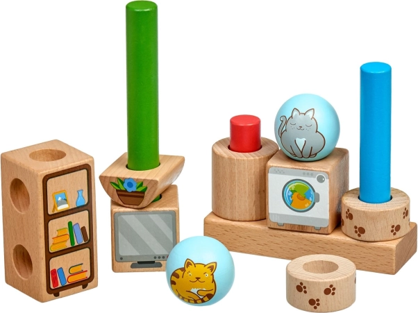 Дървеният пъзел Игриви котки носи забавно учене чрез подреждане на цветни форми върху основа с колчета. Благодарение на 24-те карти със задачи децата изпробват различни подредби и се учат да възприемат пространство, форми и цветове. Качествената дървена изработка и безопасните бои гарантират дълъг живот и комфортна игра.