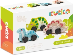 Комплектът съдържа три дървени динозавъра с колелца за лесно придвижване, идеален за малки деца.