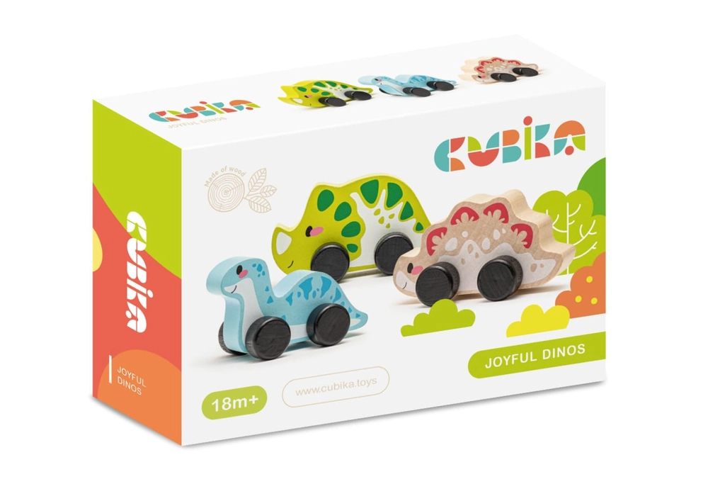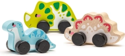 Този уникален комплект от три дървени динозавъра гарантира часове забавление за вашите малчугани. Благодарение на четирите черни колелца динозаврите се придвижват лесно и се превръщат в любими другарчета по време на игра. Всеки динозавър е с приблизителни размери 9 x 5 см и е изработен от висококачествен яворов и буков дървен материал. Използваните бои на водна основа са напълно безопасни за деца и без мирис.
