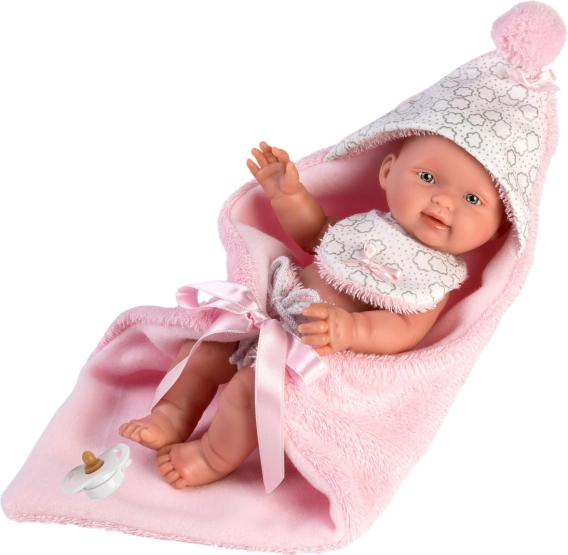 Този двуделен комплект е проектиран специално за кукла бебе New Born с размер 26 см. Съдържа двустранно одеялце с качулка, което предпазва куклата и ѝ придава вид на истинско бебе.
