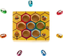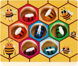 Образователна игра Пчелна пита Монтесори е красиво изработена дървена игра, която малките деца ще заобичат. С помощта на цветните пчелички децата по забавен начин упражняват координационните си умения и фината моторика.