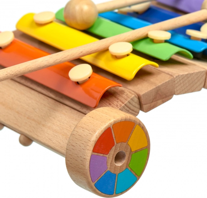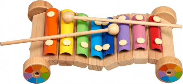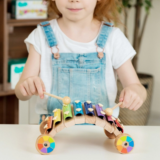Весел дъгов ксилофон върху дървено шаси с колелца развива музикалния слух, ритъма и фината моторика. Цветните метални ламели издават чисти тонове, включени са 2 дървени палки. Безопасната изработка и здравата конструкция го правят идеална образователна играчка за деца в предучилищна възраст.