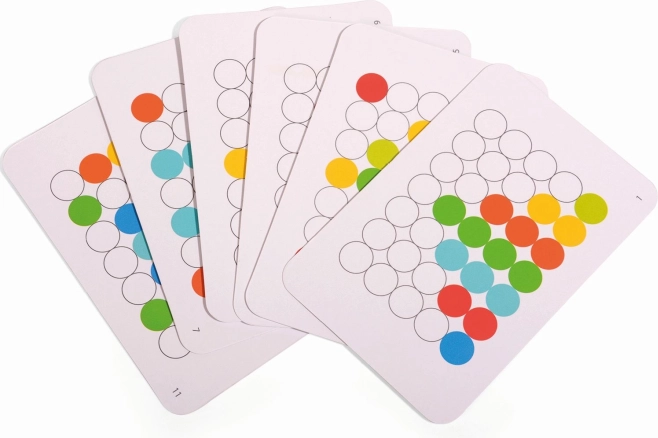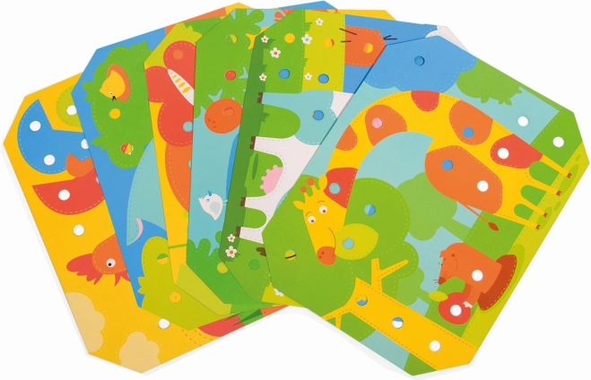 Мозайката и бродирането са отличен инструмент за малките деца за развитие на фините моторни умения и креативността. Съдържа 35 големи силиконови пинчета в седем ярки цвята, с които децата могат да запълват цветните шаблони. Комплектът включва още 12 цветни картинки с животни и 6 двустранни шаблона.