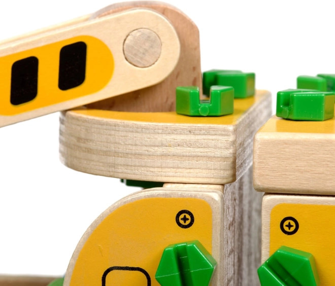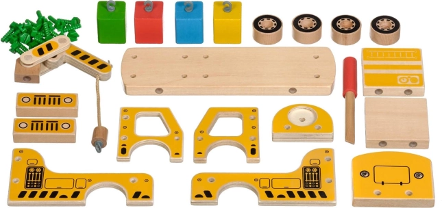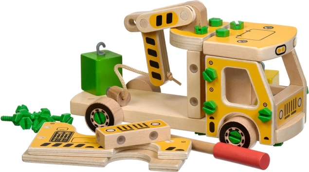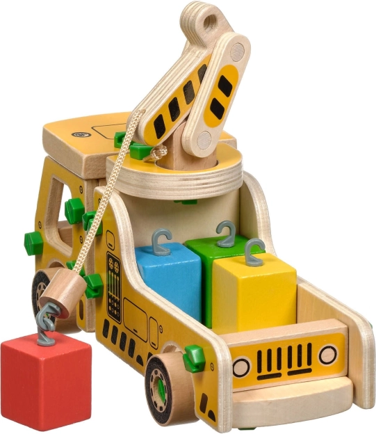 Комплектът съдържа 16 дървени части за сглобяване на кран, винтове, отвертка и 4 цветни блокчета, представляващи товар. Играчката също така служи като помощник по Монтесори, който помага на детето ефективно да развива разнообразни умения.