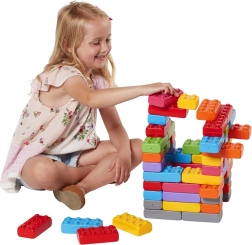 Голямоформатните кубчета, вдъхновени от истински тухли, издигат детското строене на ново ниво. Благодарение на ниското тегло и безопасното оформяне те са идеални за малки строители още от 1 година. Комплектът е проектиран така, че от 110-те части да възникват впечатляващи проекти – от прости стени до фантазни конструкции.