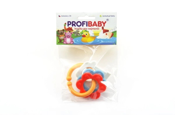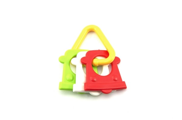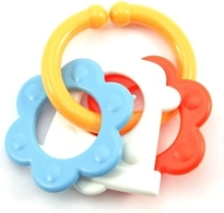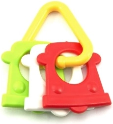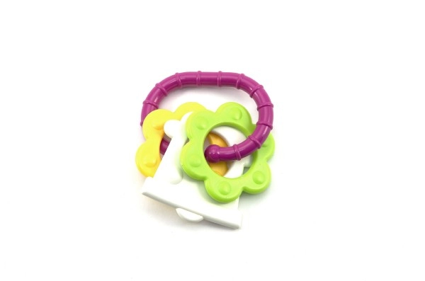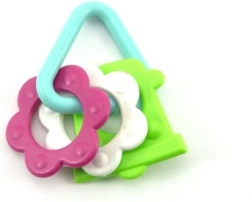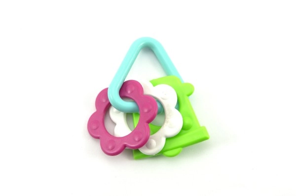 Нашата цветна пластмасова гризалка е проектирана за малки ръчички, които лесно могат да хванат всяка от нейните форми. Благодарение на разнообразието си вашето бебе ще стимулира както сетивата, така и венците.