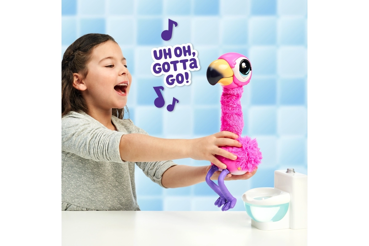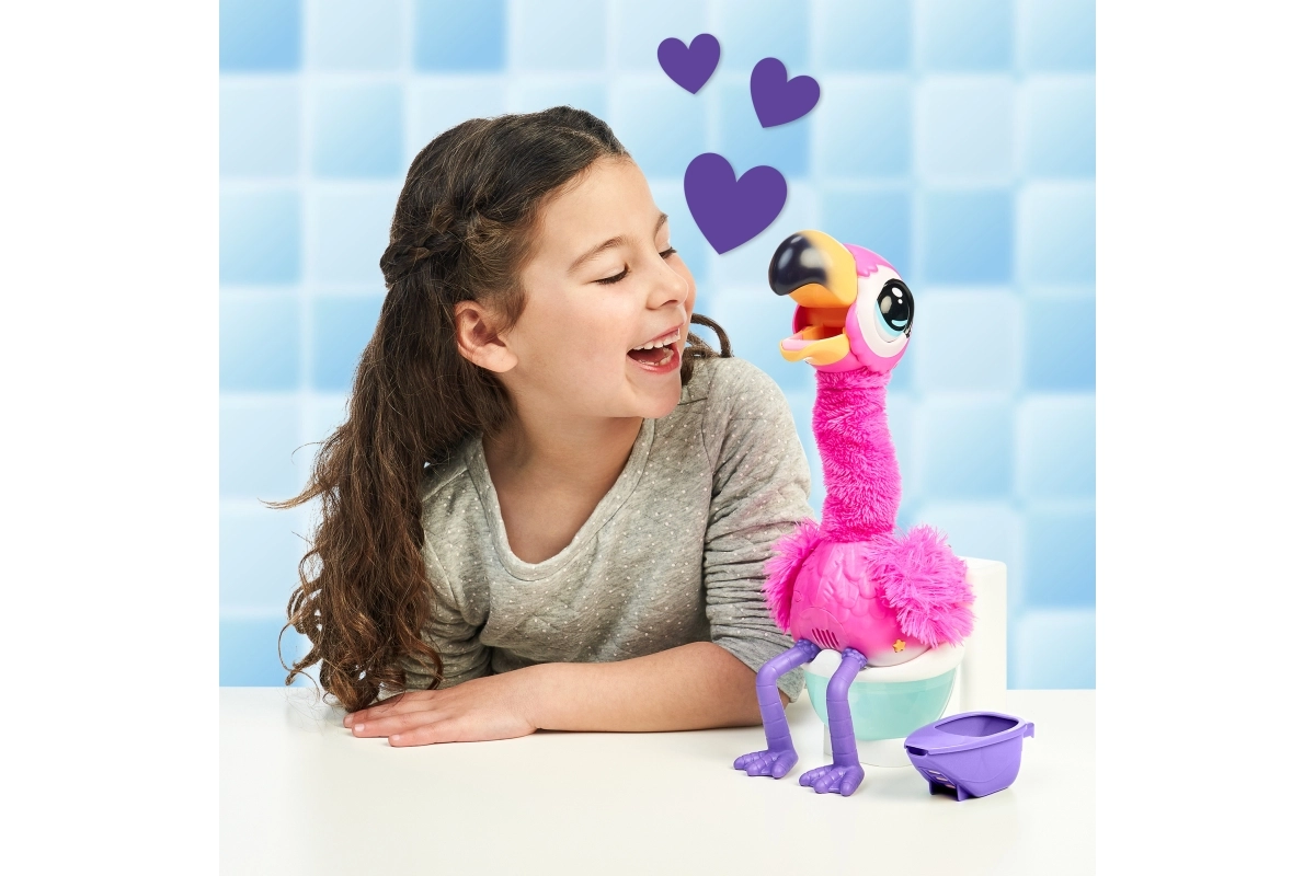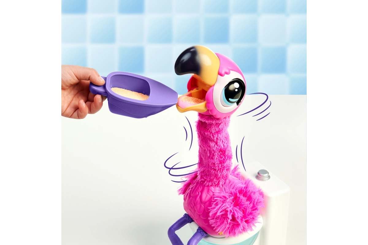 Забавното интерактивно фламинго Little Live Pets ще зарадва децата с това, че се оставя да бъде хранено със специалния пясък Aqua, пее, танцува, говори и след хранене отива до тоалетната. Известява с английската фраза „Uh, oh, I gotta go“, повтаря думите на своя стопанин и благодарение на многократно използваемия пясък забавлението продължава отново и отново.